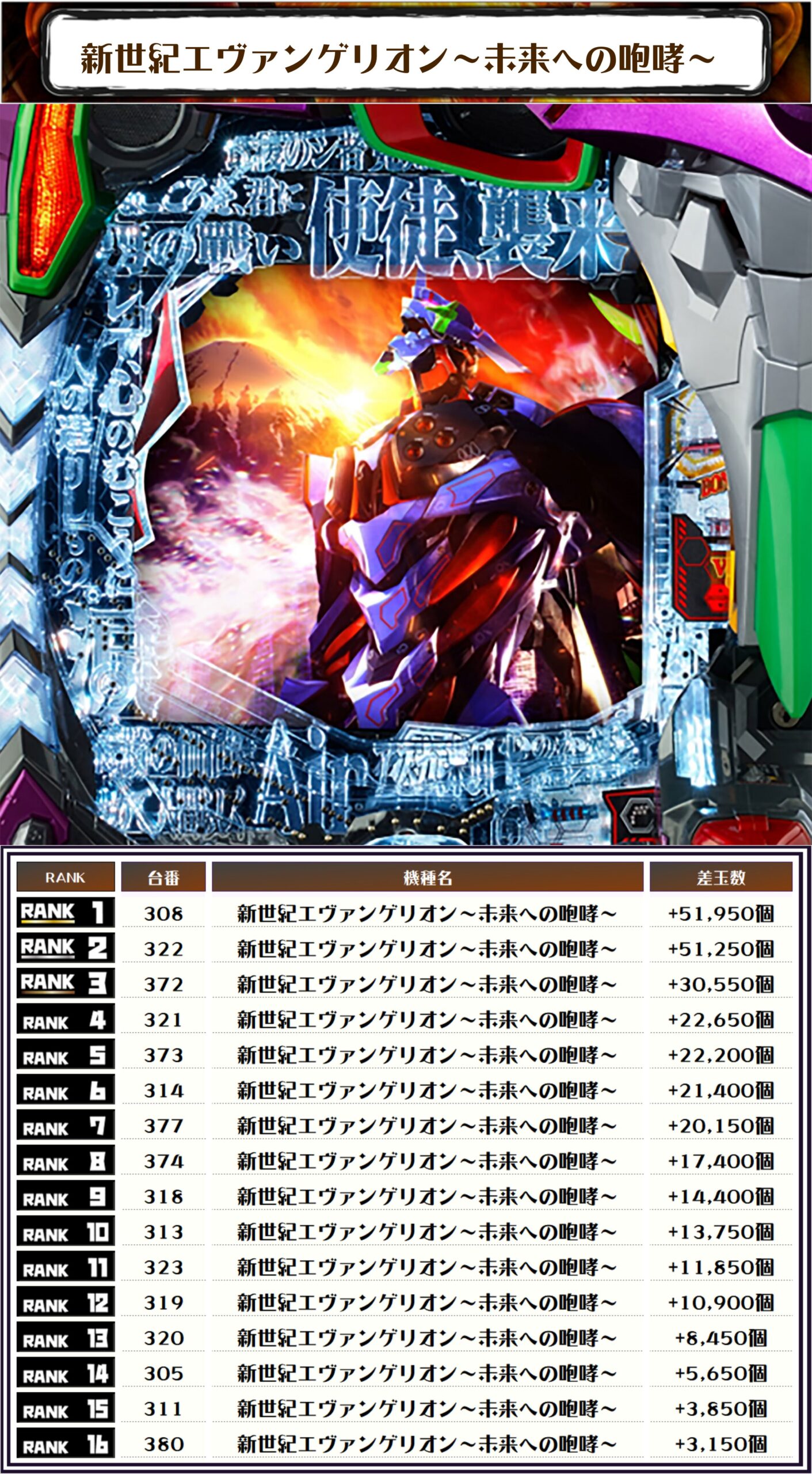 続く2位には同じく【新世紀エヴァンゲリオン~未来への咆哮~・308番台】の+51,950発、そして3位には【新世紀エヴァンゲリオン~未来への咆哮~・322番台】の+51,250発がランクインしたぞっ💪