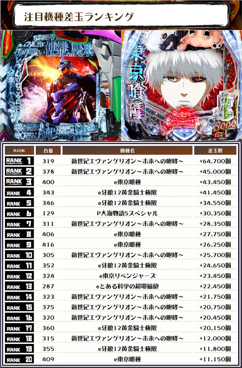 続く2位には同じく【新世紀エヴァンゲリオン~未来への咆哮~・378番台】の+45,000発、そして3位には【e東京喰種・400番台】の+43,450発がランクインしたぞっ💪