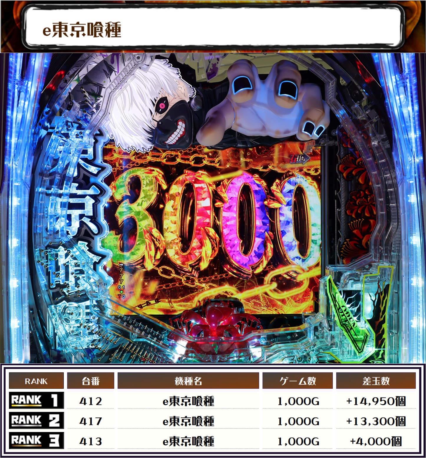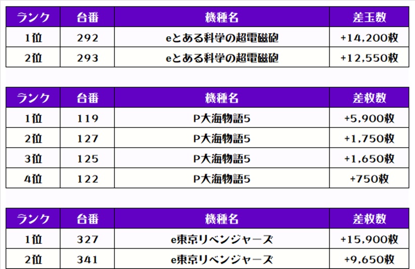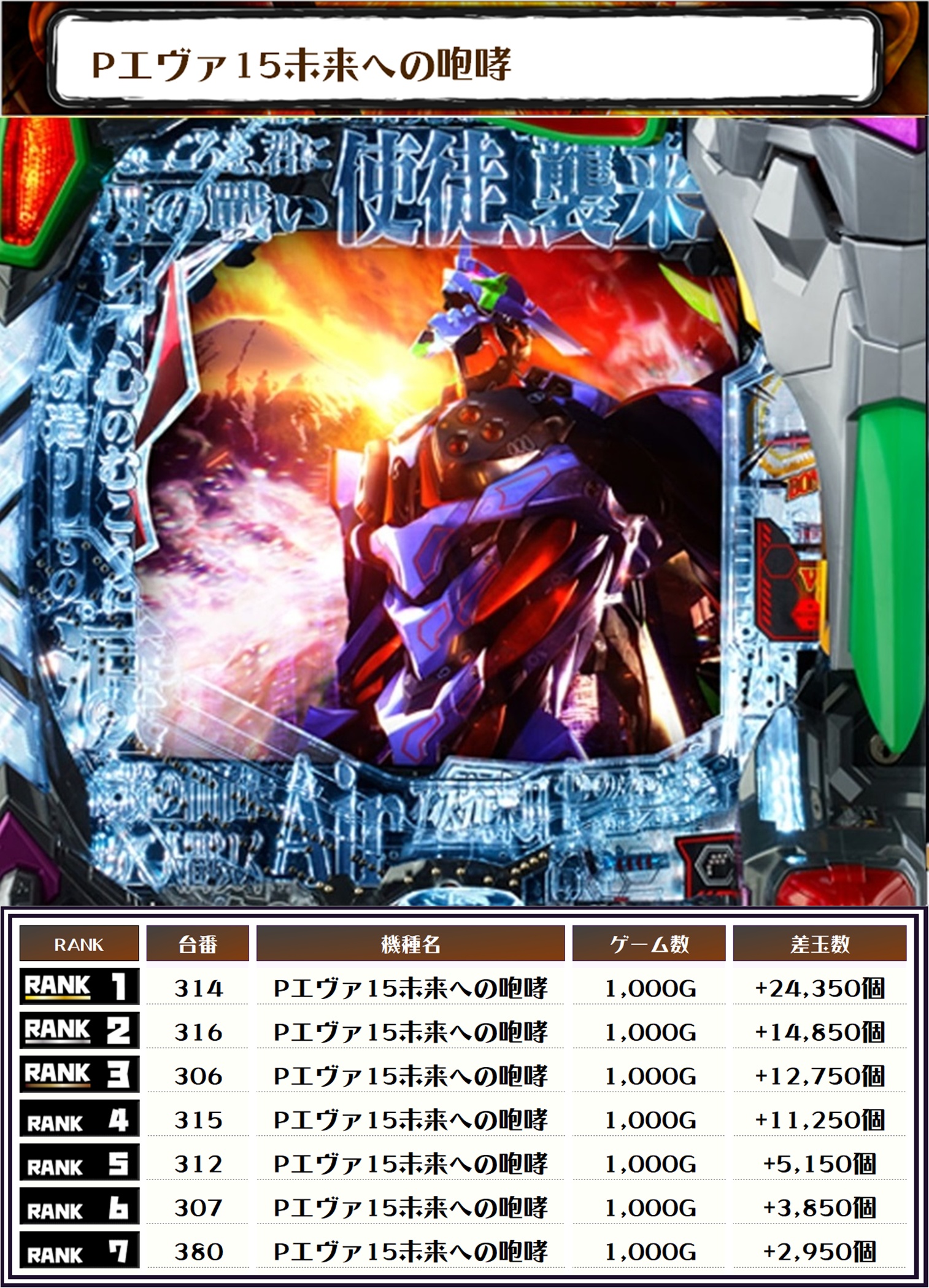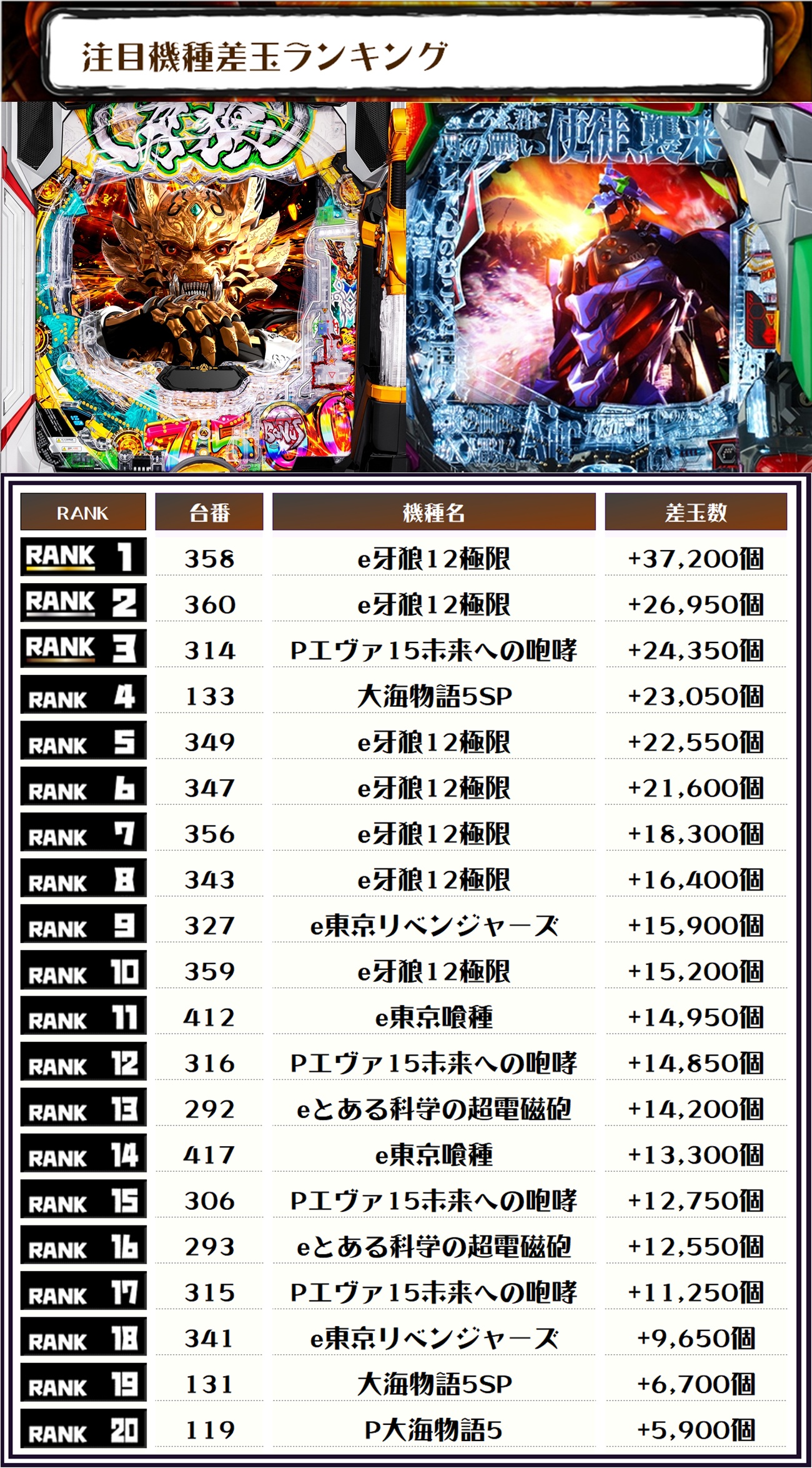 続く2位も同機種の【e牙狼12黄金騎士極限・360番台】の+26,950発、そして3位には【Pエヴァ15未来への咆哮・3145番台】の+24,350発がランクインしたぞっ💪