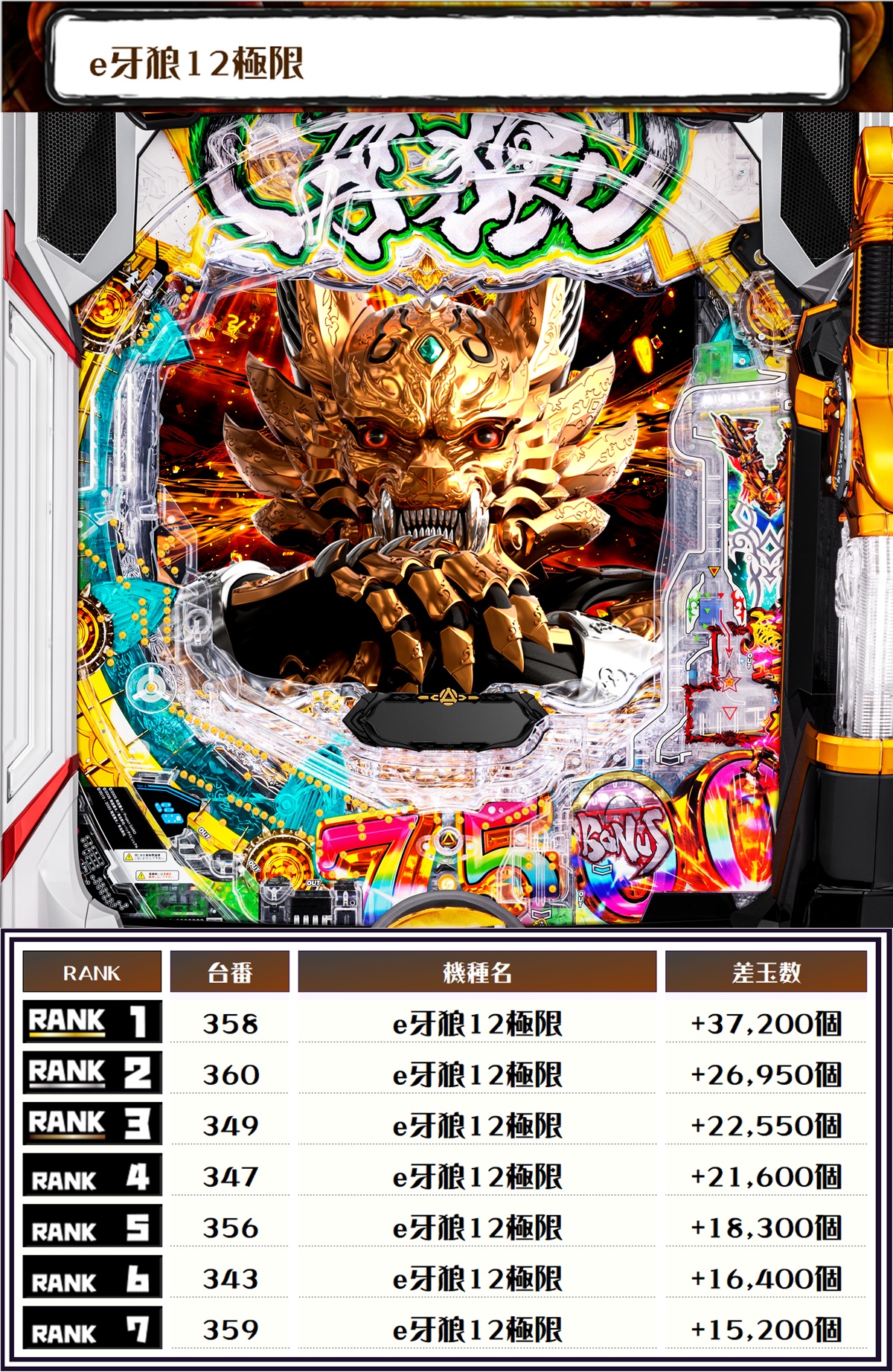 本日のTOPに輝いたのは【e牙狼12黄金騎士極限・358番台】で+37,200発👍