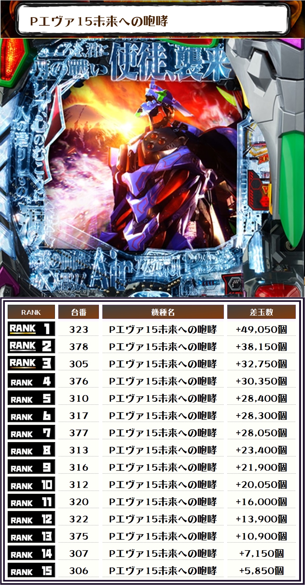 本日のTOPに輝いたのは【Pエヴァ15未来への咆哮・323番台】で+49,050発👍