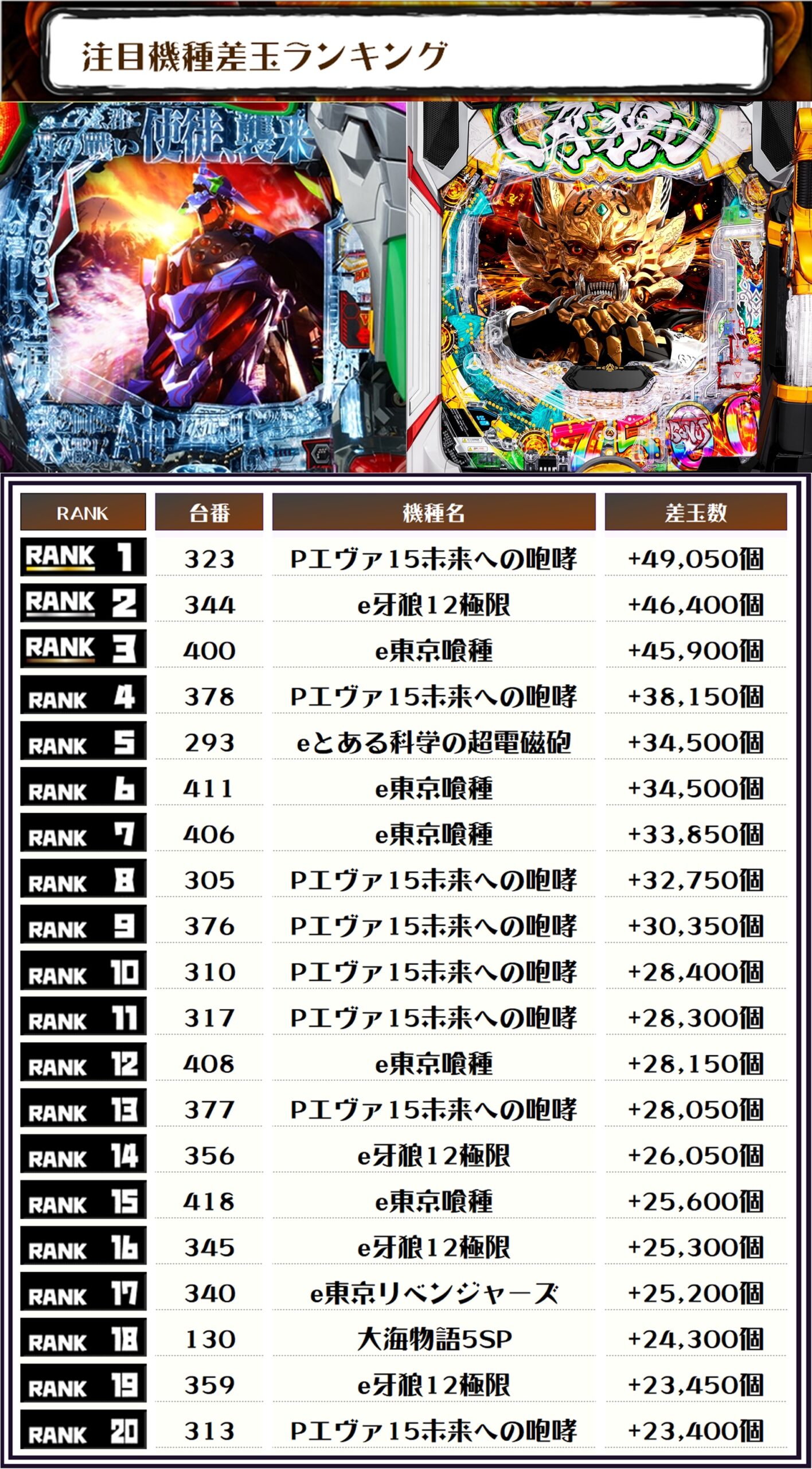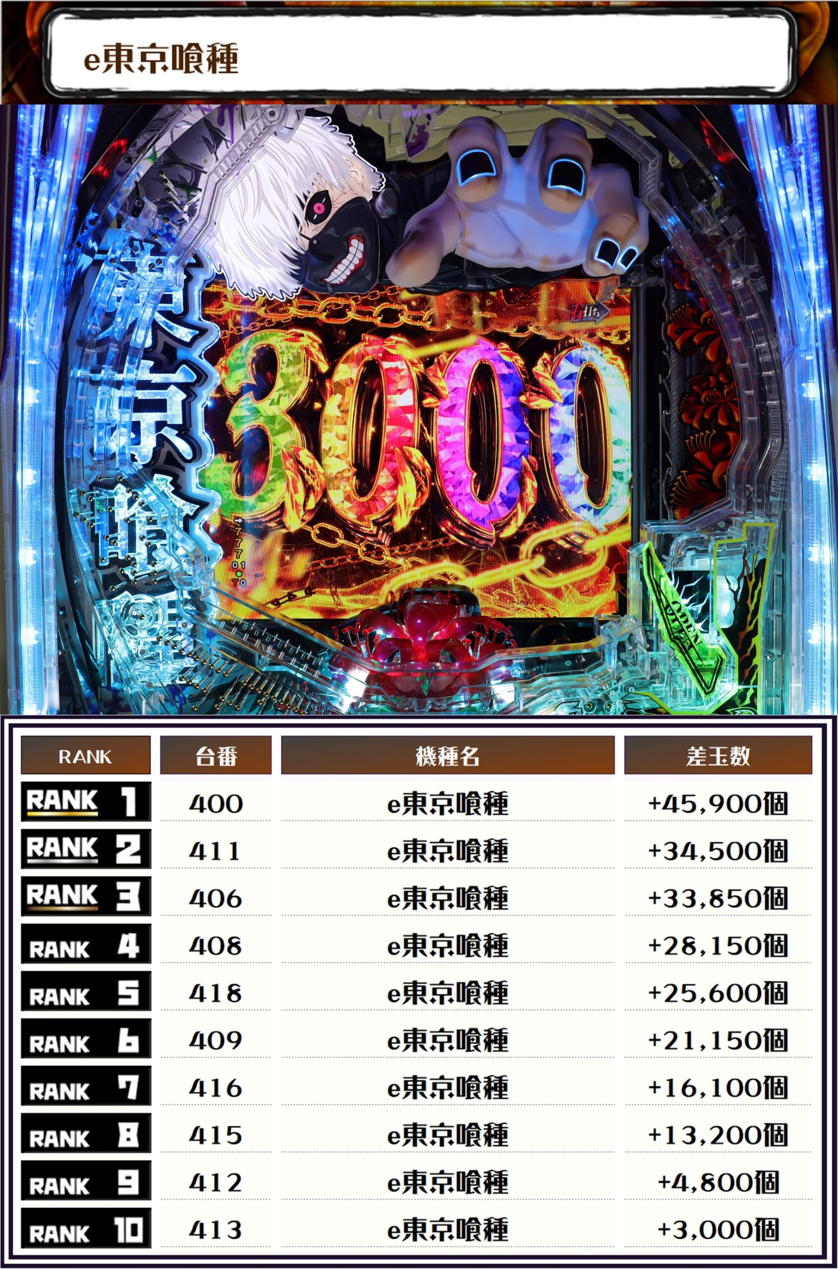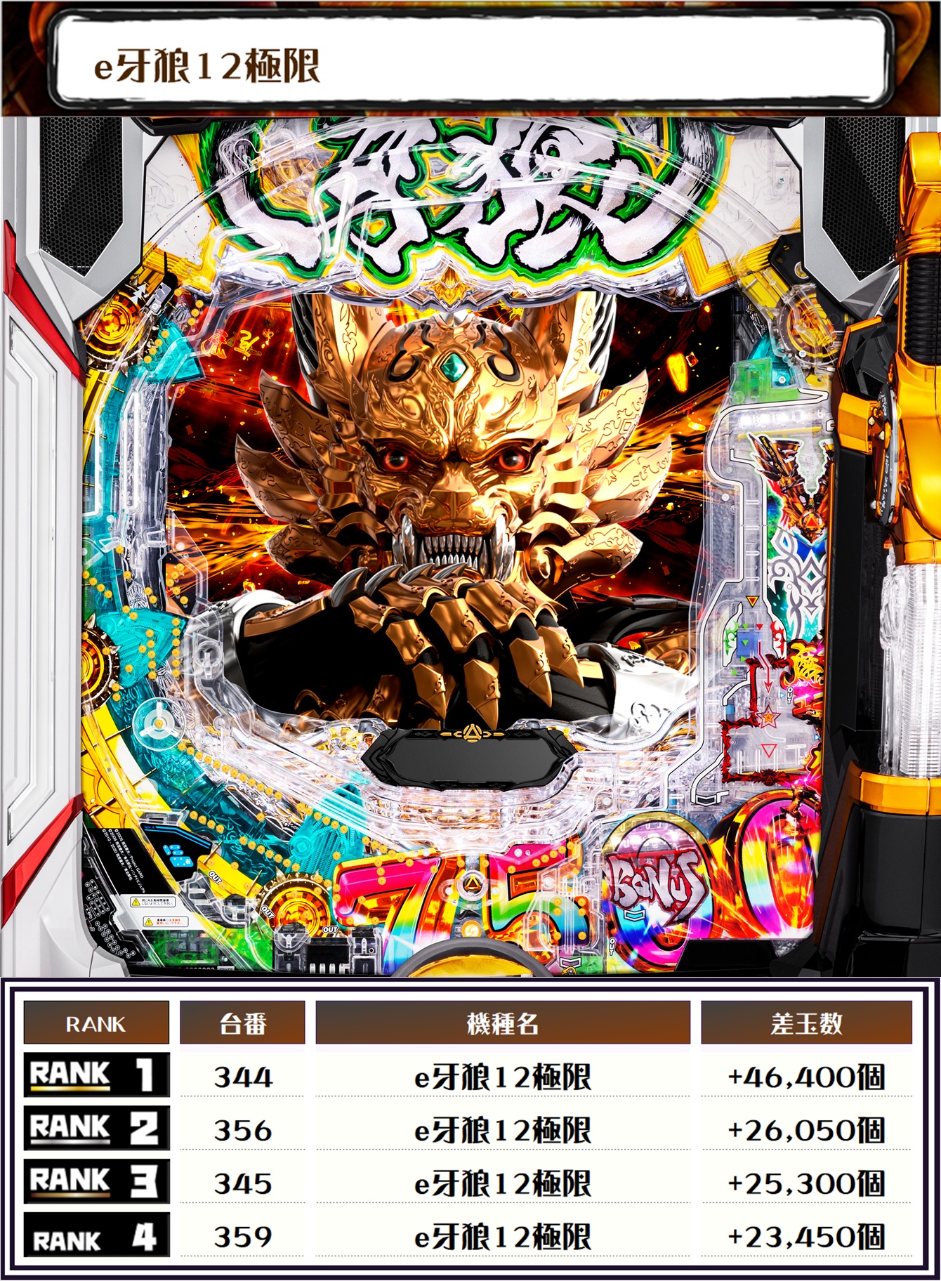 続く2位は【e牙狼12黄金騎士極限・344番台】の+46,400発、そして3位には【e東京喰種・3145番台】の+45,900発がランクインしたぞっ💪