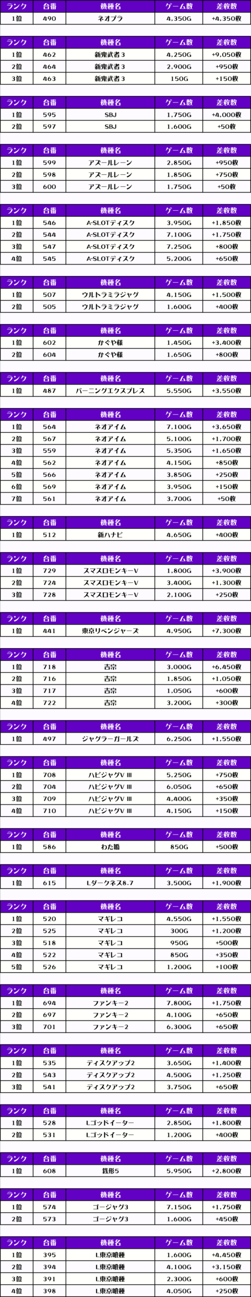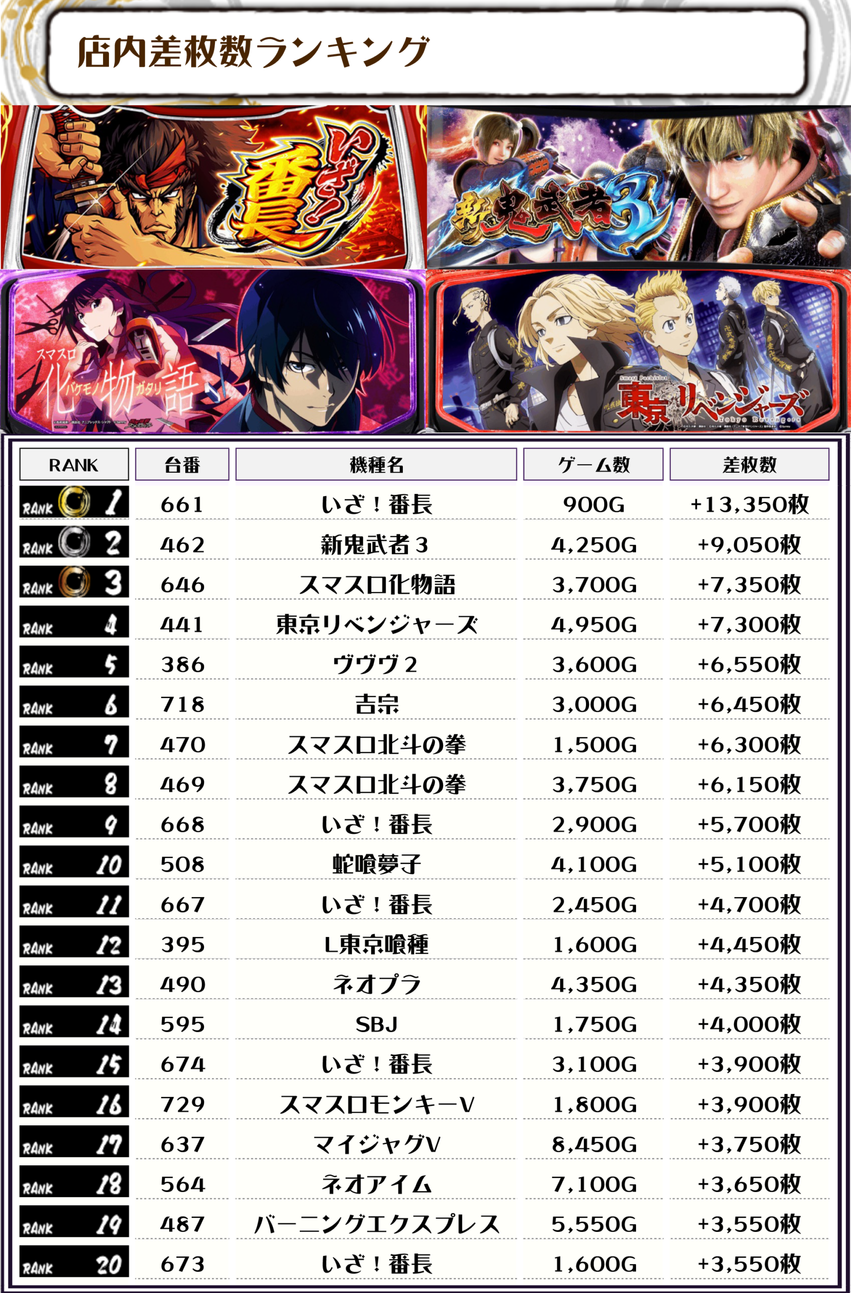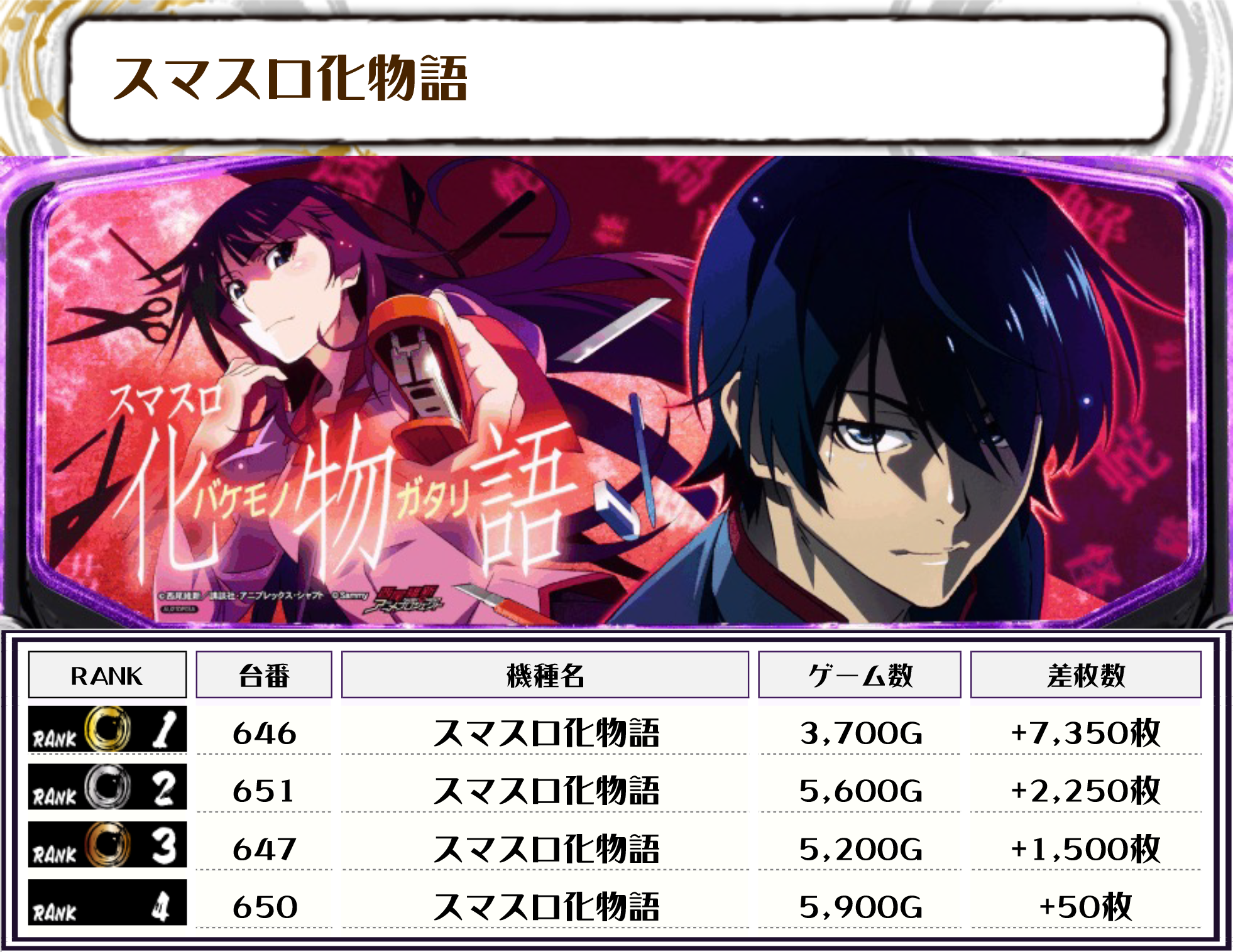 2位には【新鬼武者3・462番台】の+9,050枚、3位には【スマスロ化物語・646番台】の+7,350枚がランクインしました📷