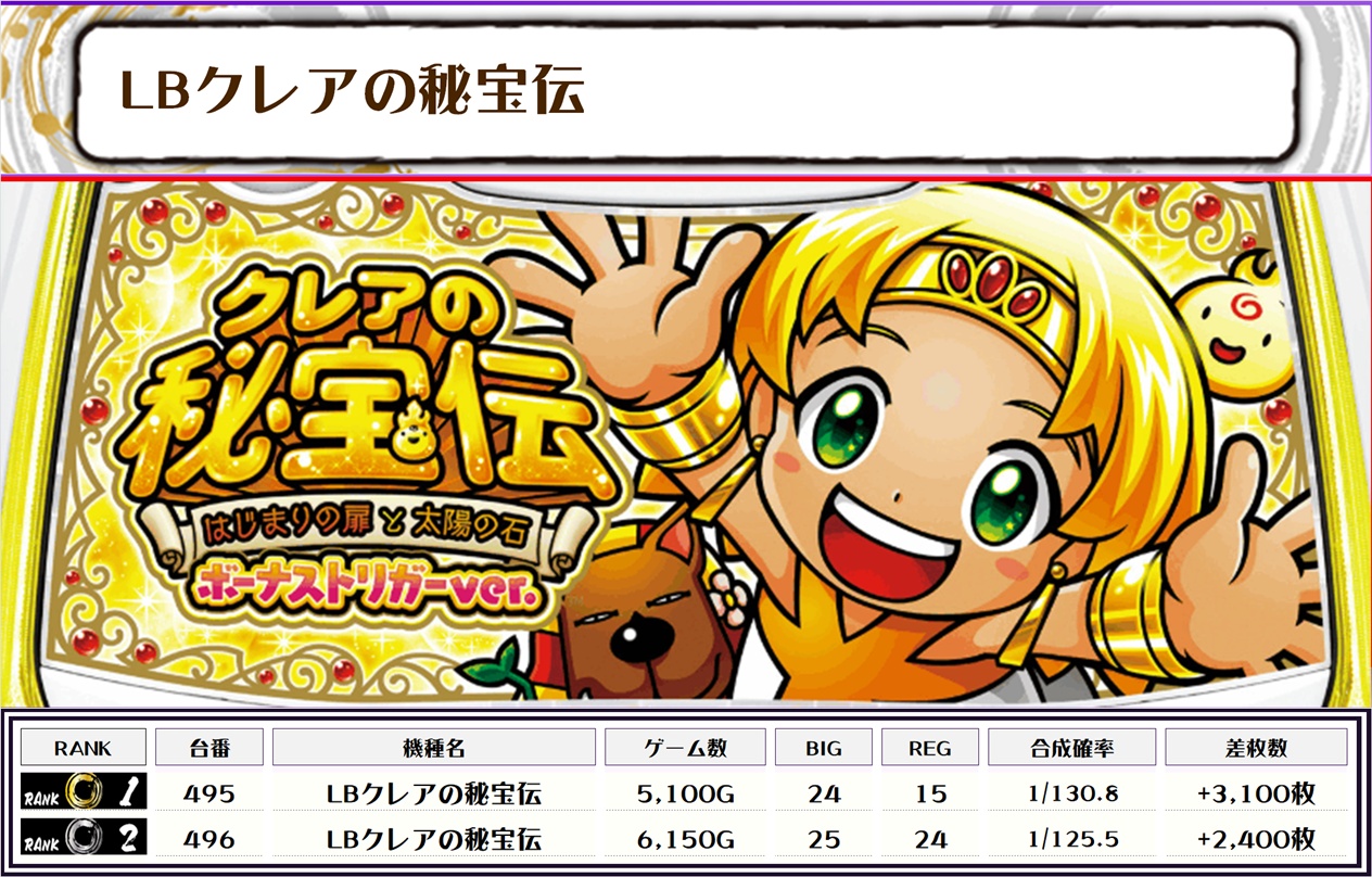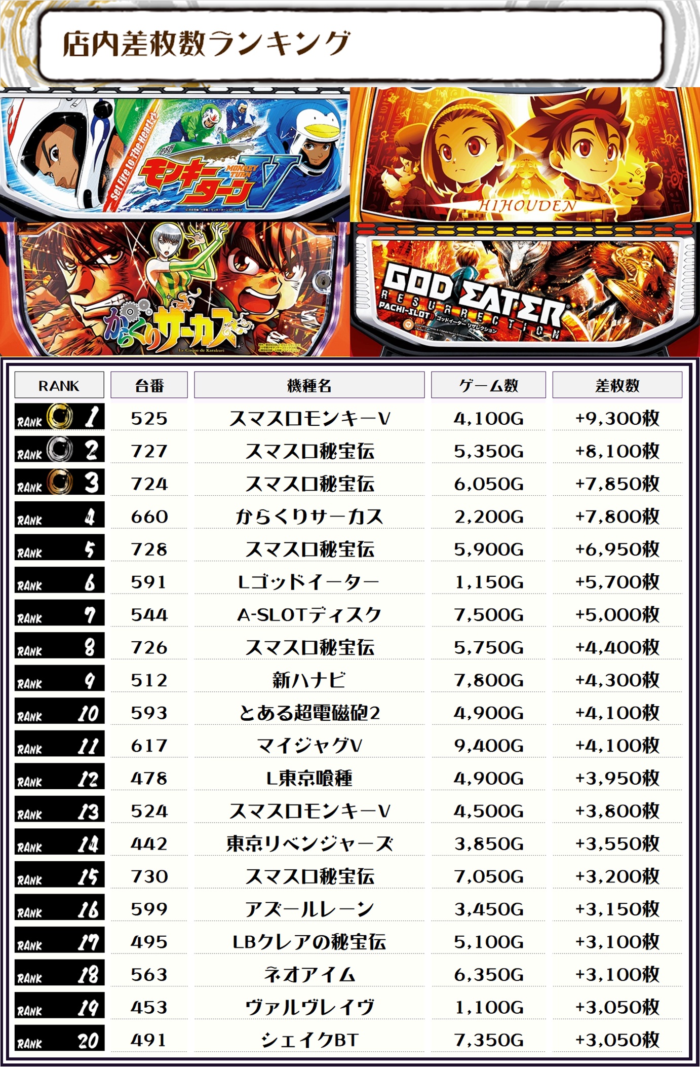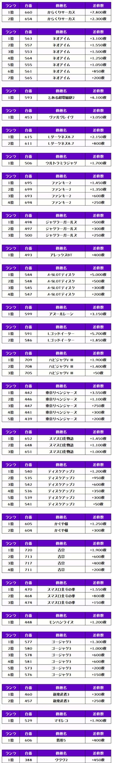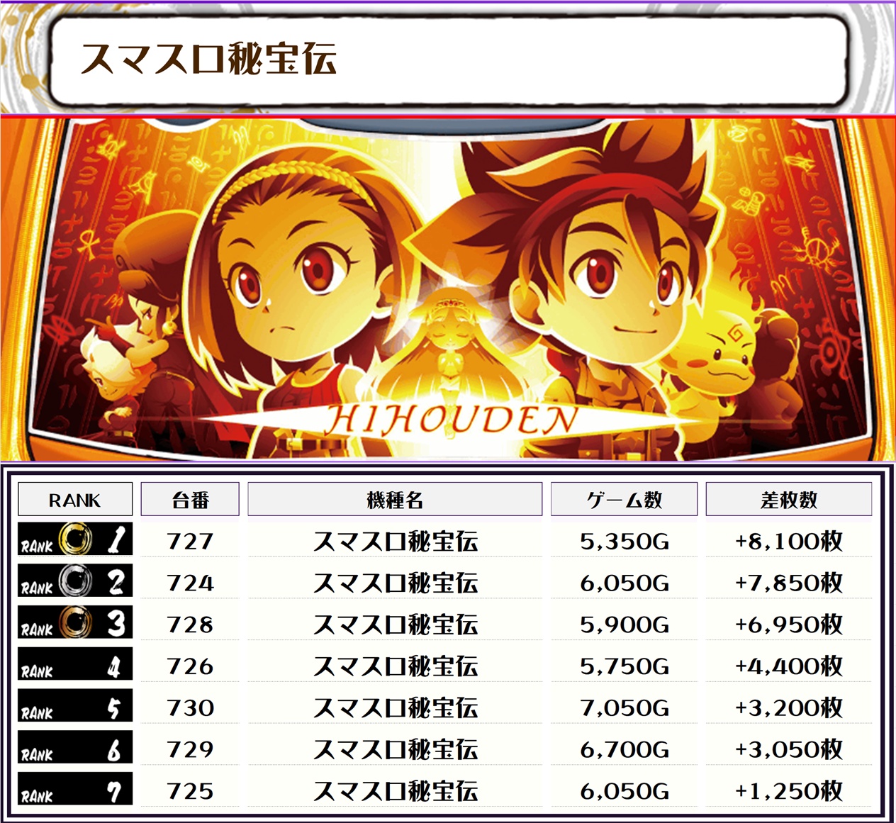 2位には【スマスロ秘宝伝・727番台】の+8,100枚、3位には【スマスロ秘宝伝・724番台】の+7,850枚がランクインしました📷