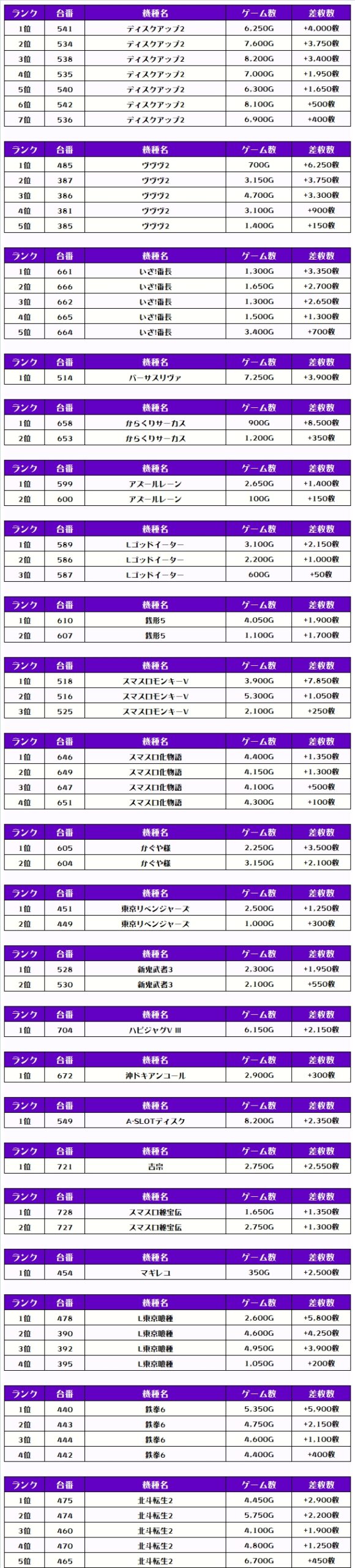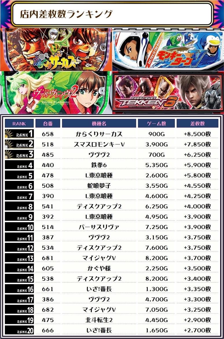 2位には【スマスロモンキーV・518番台】の+7,850枚、3位にも【ヴヴヴ2・485番台】の+6,250枚がランクインです💥