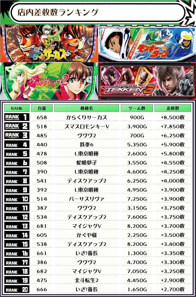 そして、全体の差枚ランキングがこちらっ✨