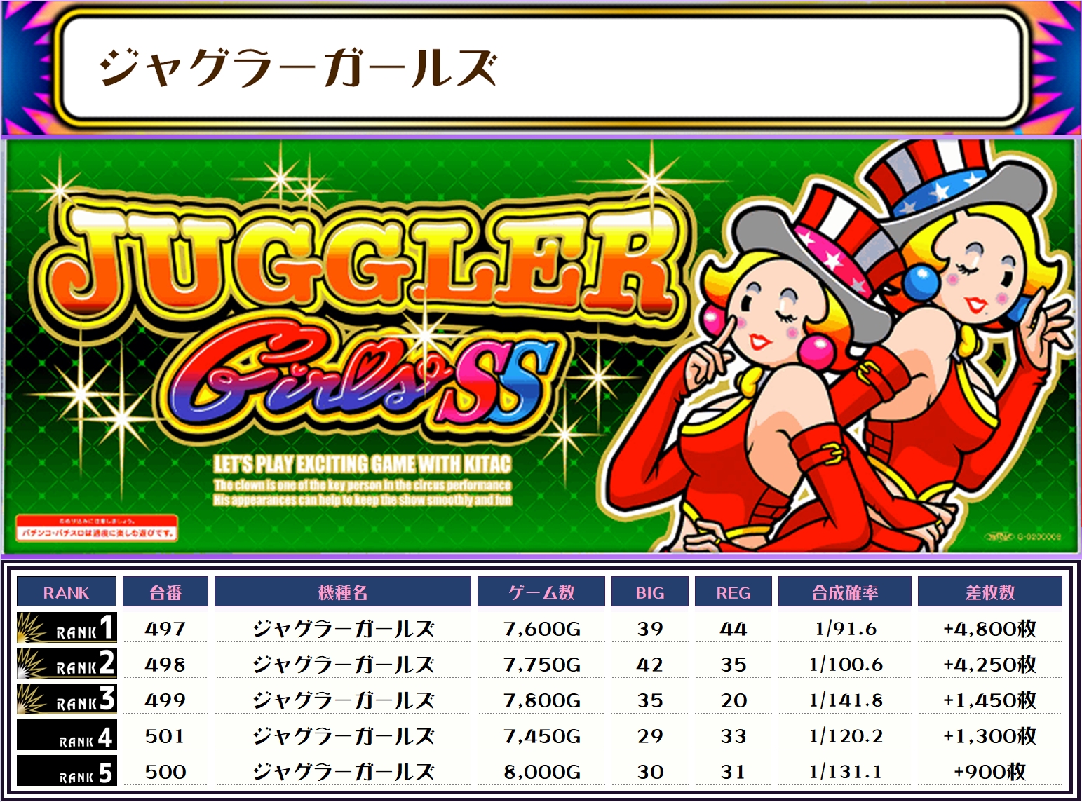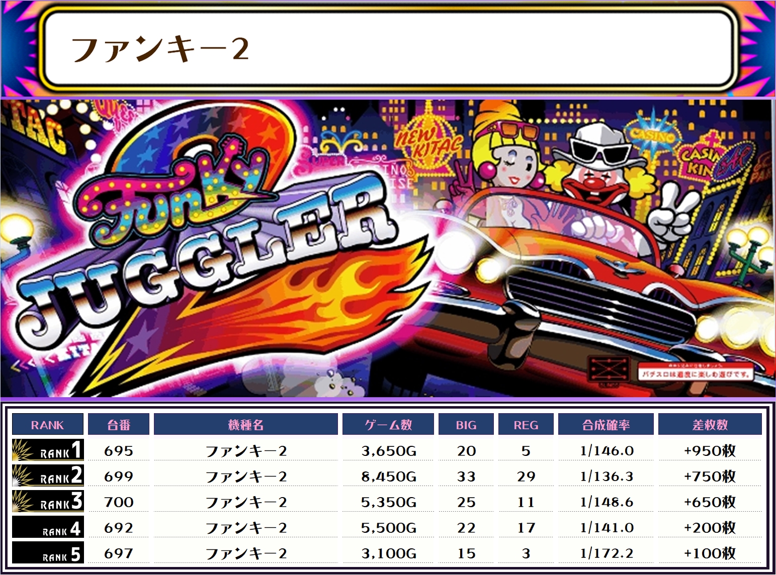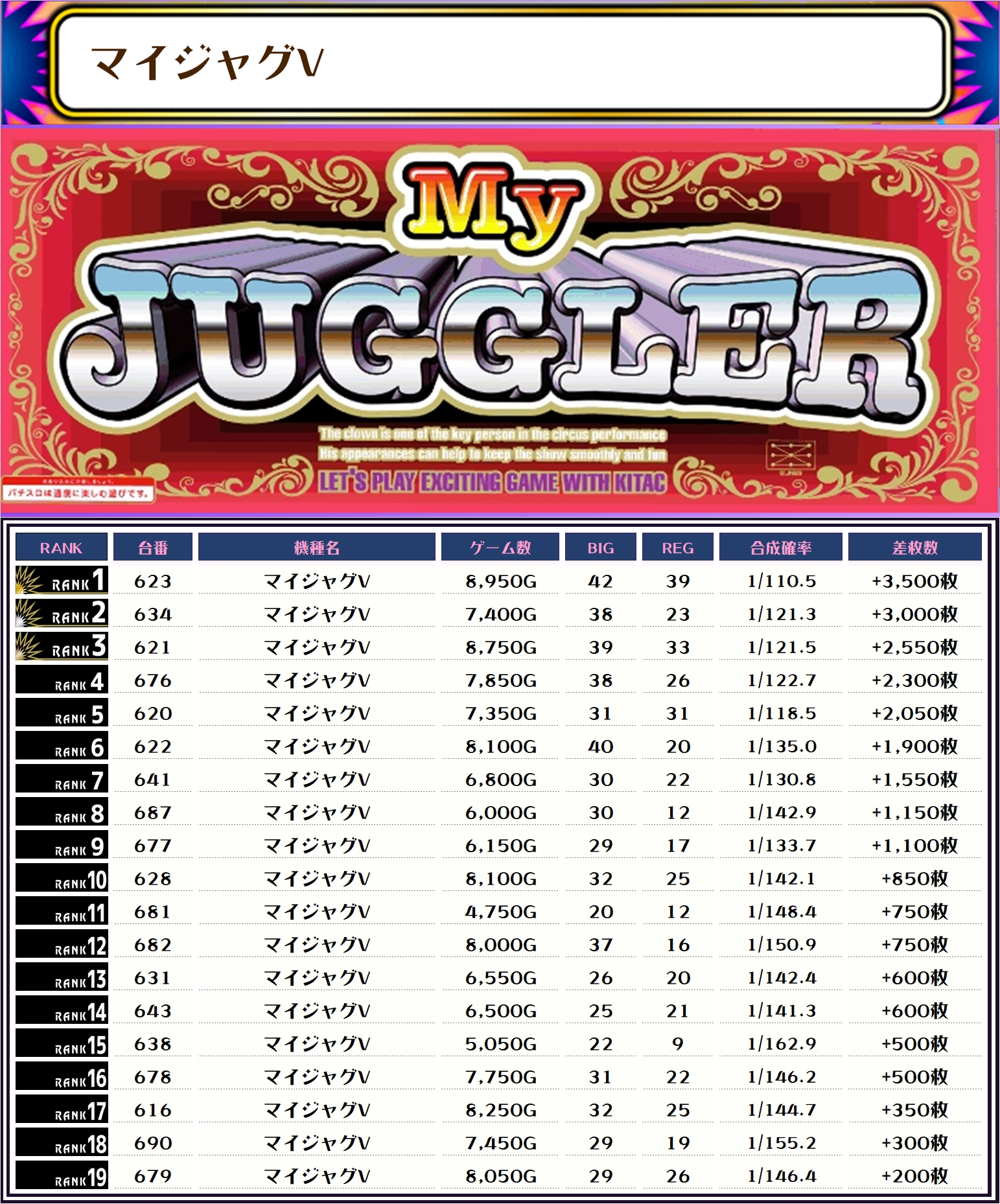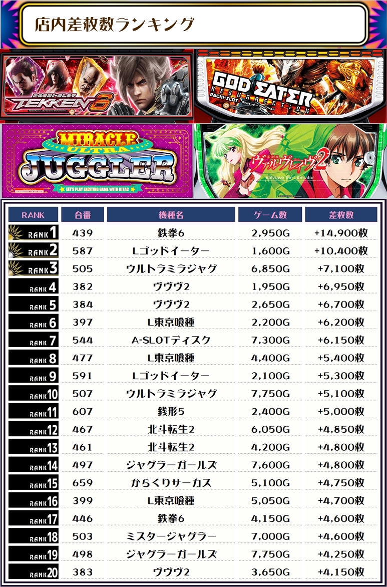 ちなみに、この取材では複数台設置の全機種および全体差枚トップ20ランキング形式でお伝えしていきます!!