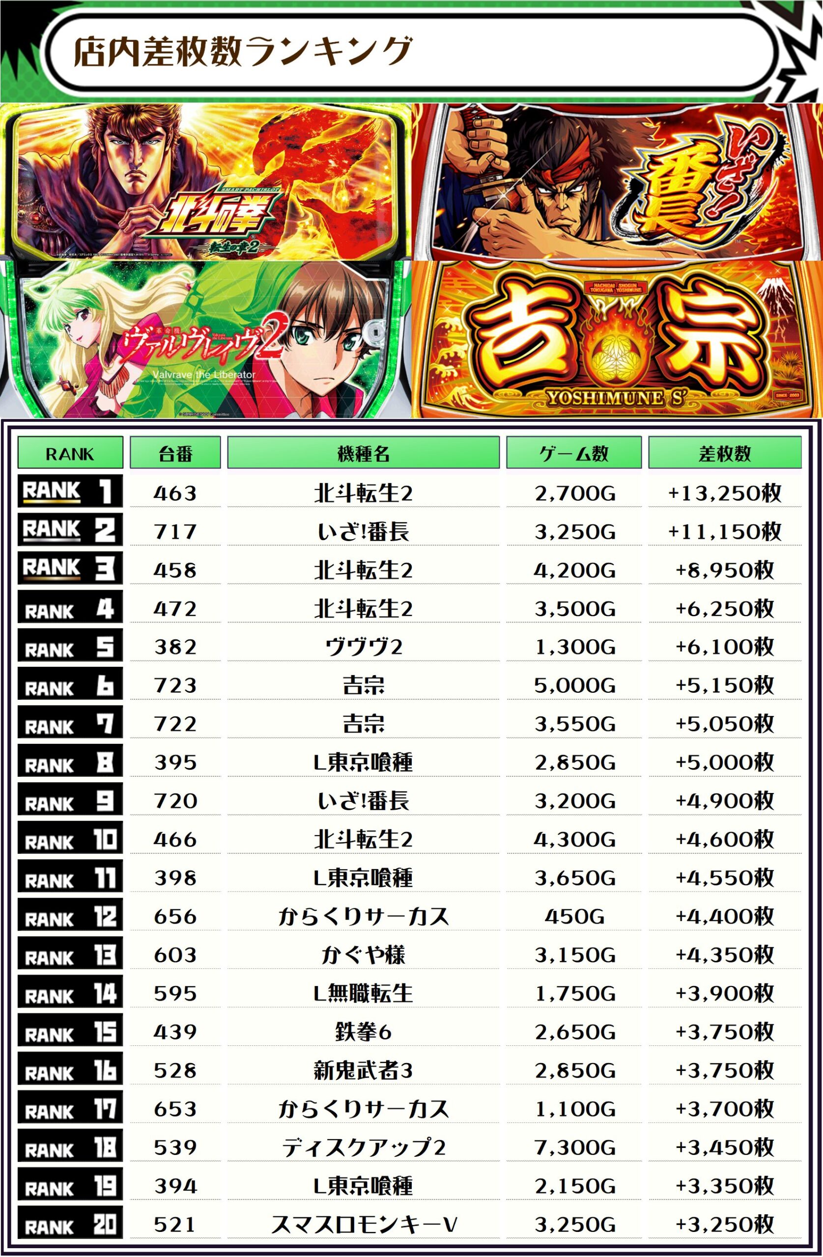 2位には【いざ!番長・7177番台】の+11,150枚、3位には【北斗転生2・458番台】の+8,950枚がランクインです💥