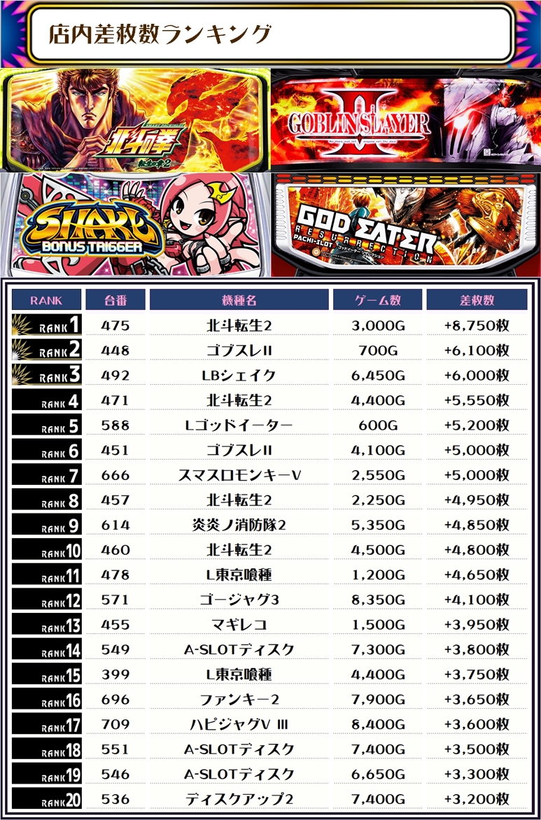 ゴブスレⅡ・炎炎ノ消防隊2などの新しめの台から、東京喰種、ゴッドイーターなど定番の人気機種までバラエティーに富んだランキングになりました👏👏👏
