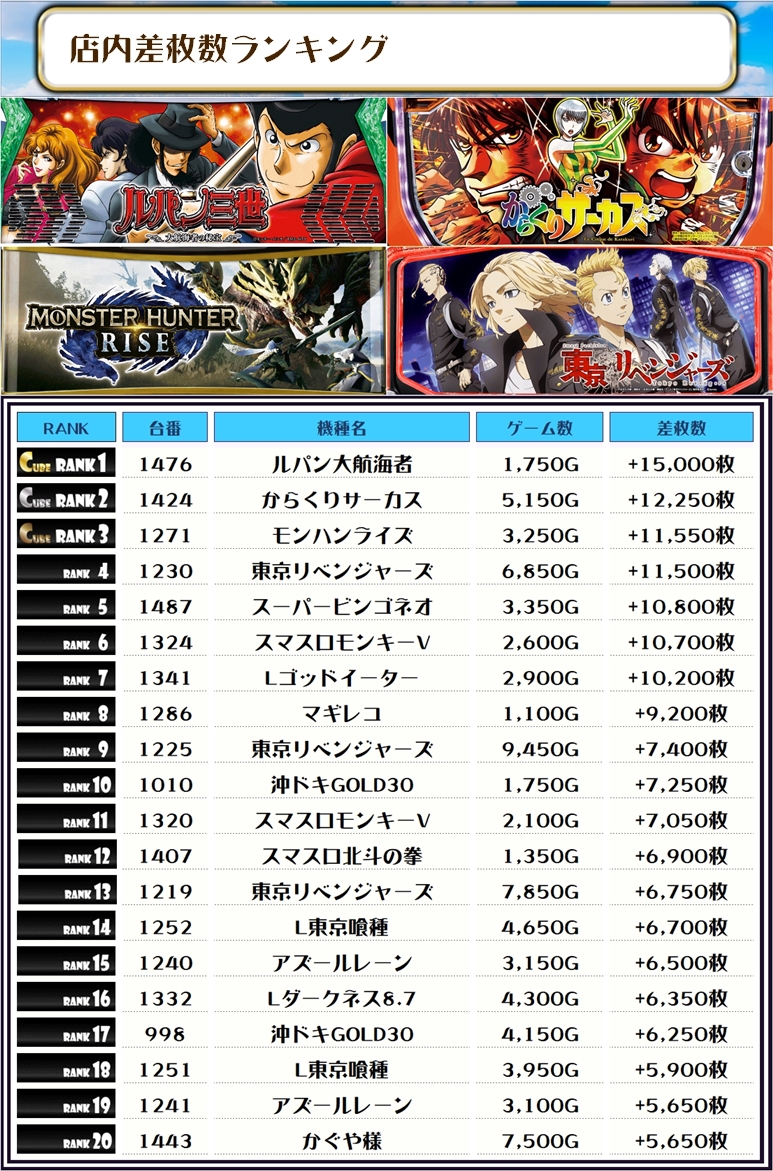 2位には【からくりサーカス・1424番台】の+12,250枚、そして3位には【モンハンライズ・1271番台】の+11,550枚がランクインっ✨