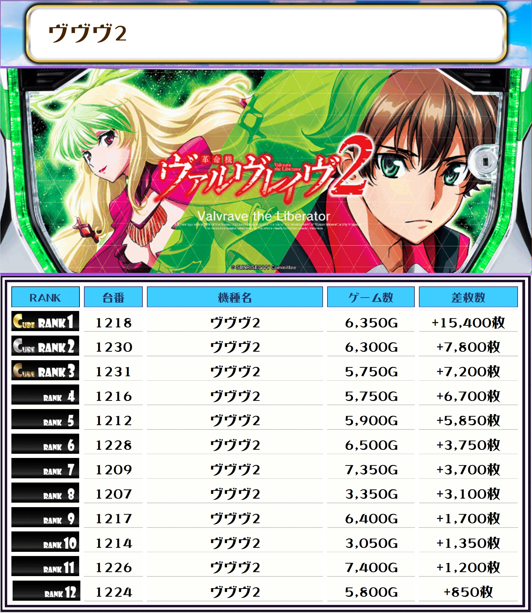 この日、全体差枚トップに輝いたのは【ヴヴヴ2・1218番台】で+15,400枚👑👑👑