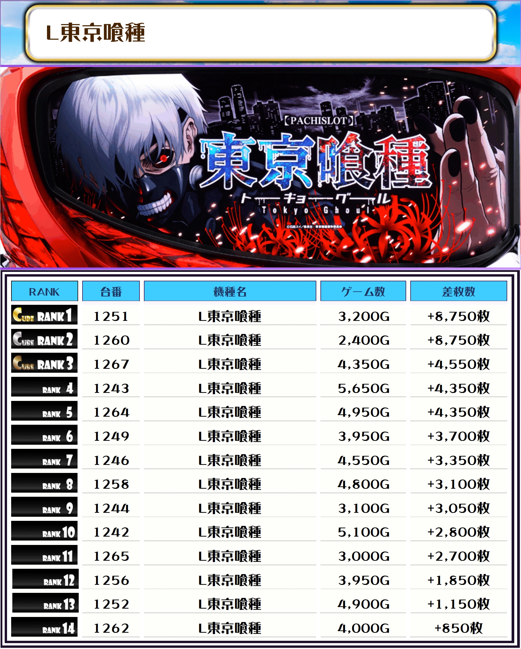 そして、今回あっしがピックアップしたのは、L東京喰種・炎炎ノ消防隊2・ネオアイム・ゴージャグ3の4機種でやんす📷