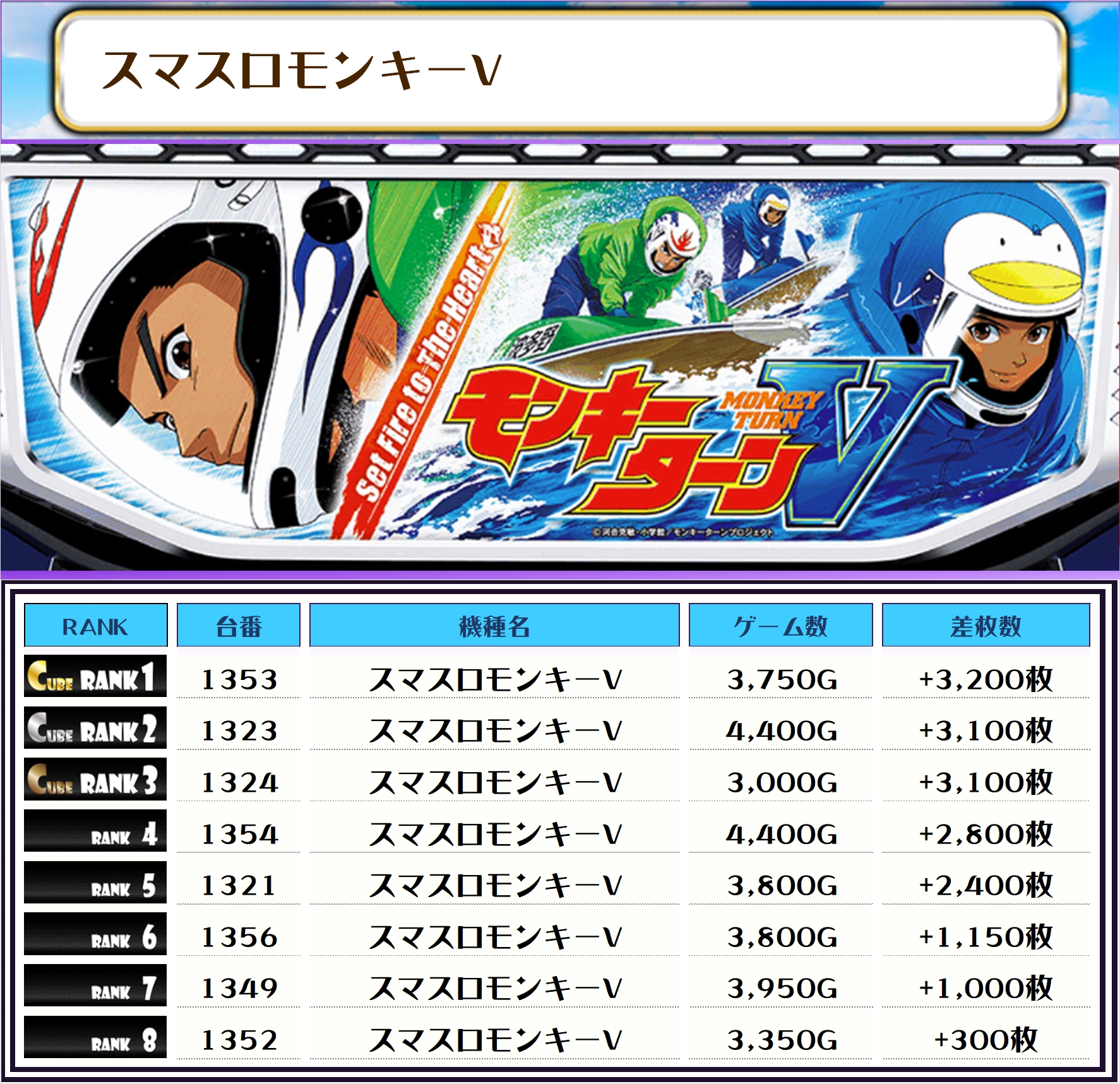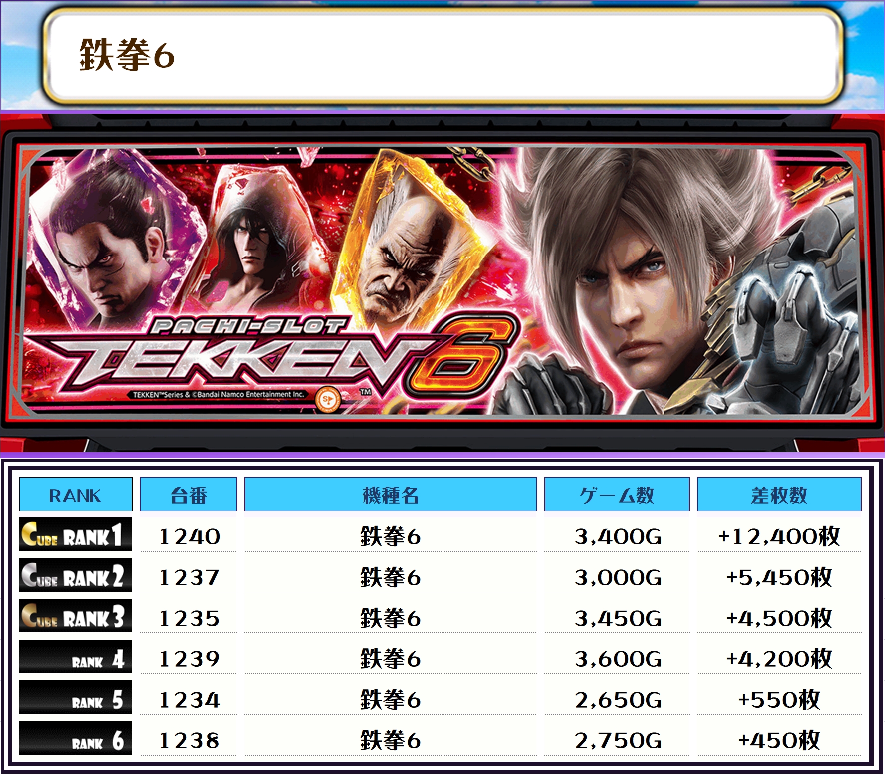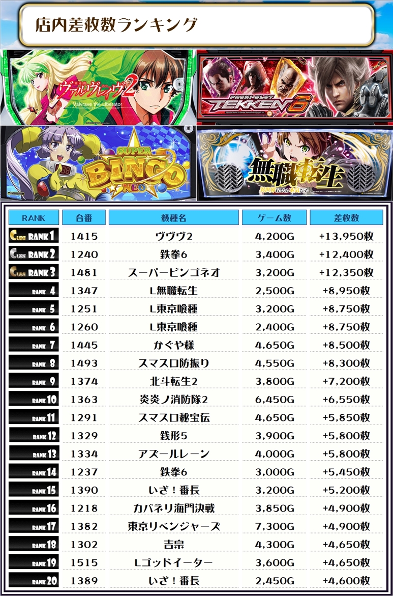 続く2位には【鉄拳6・1240番台】の+12,400枚、そして3位には【スーパービンゴネオ・1481番台】の+12,350枚がランクインっ✨