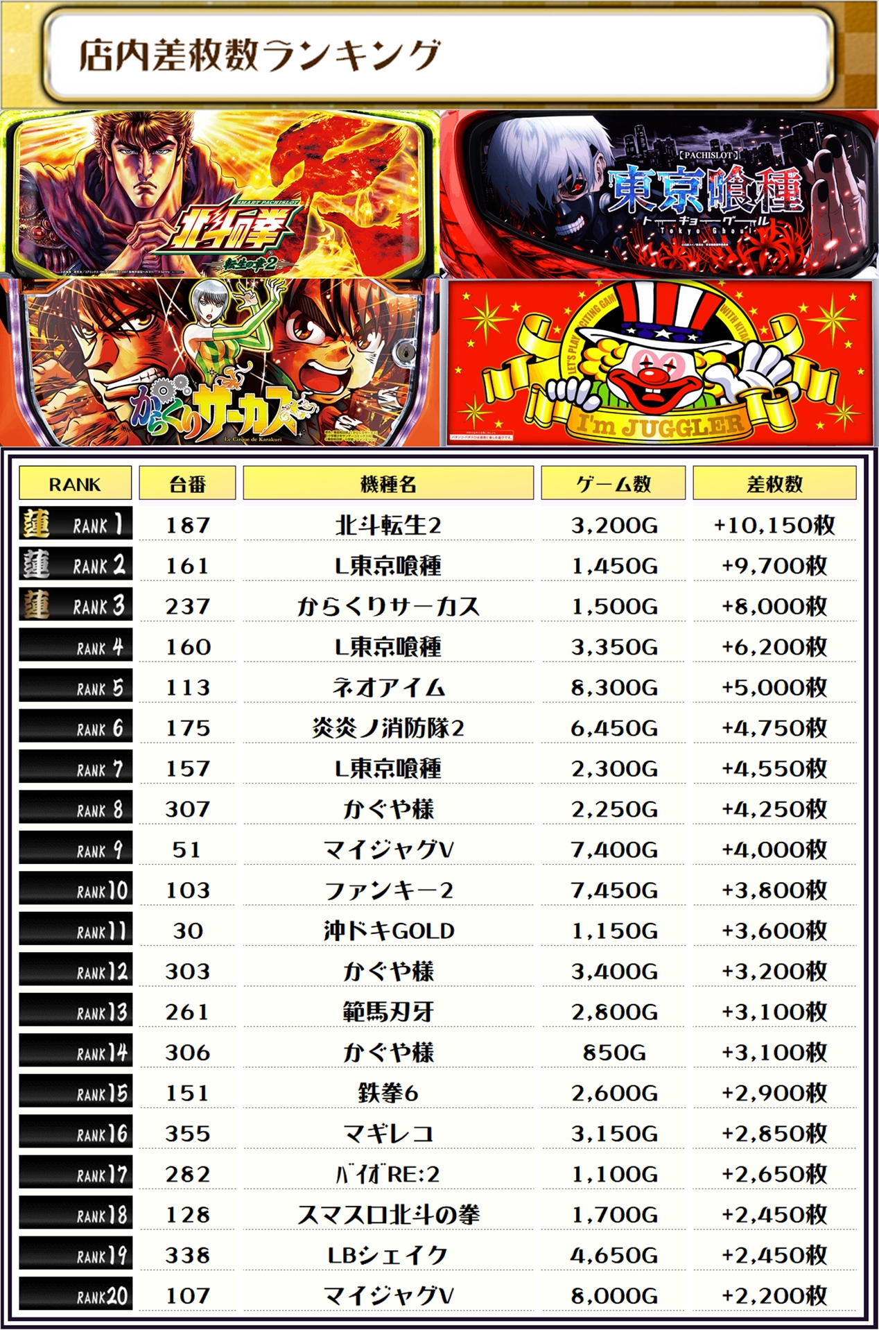 最後に、この日の店内差枚ランキングをご覧ください❗️