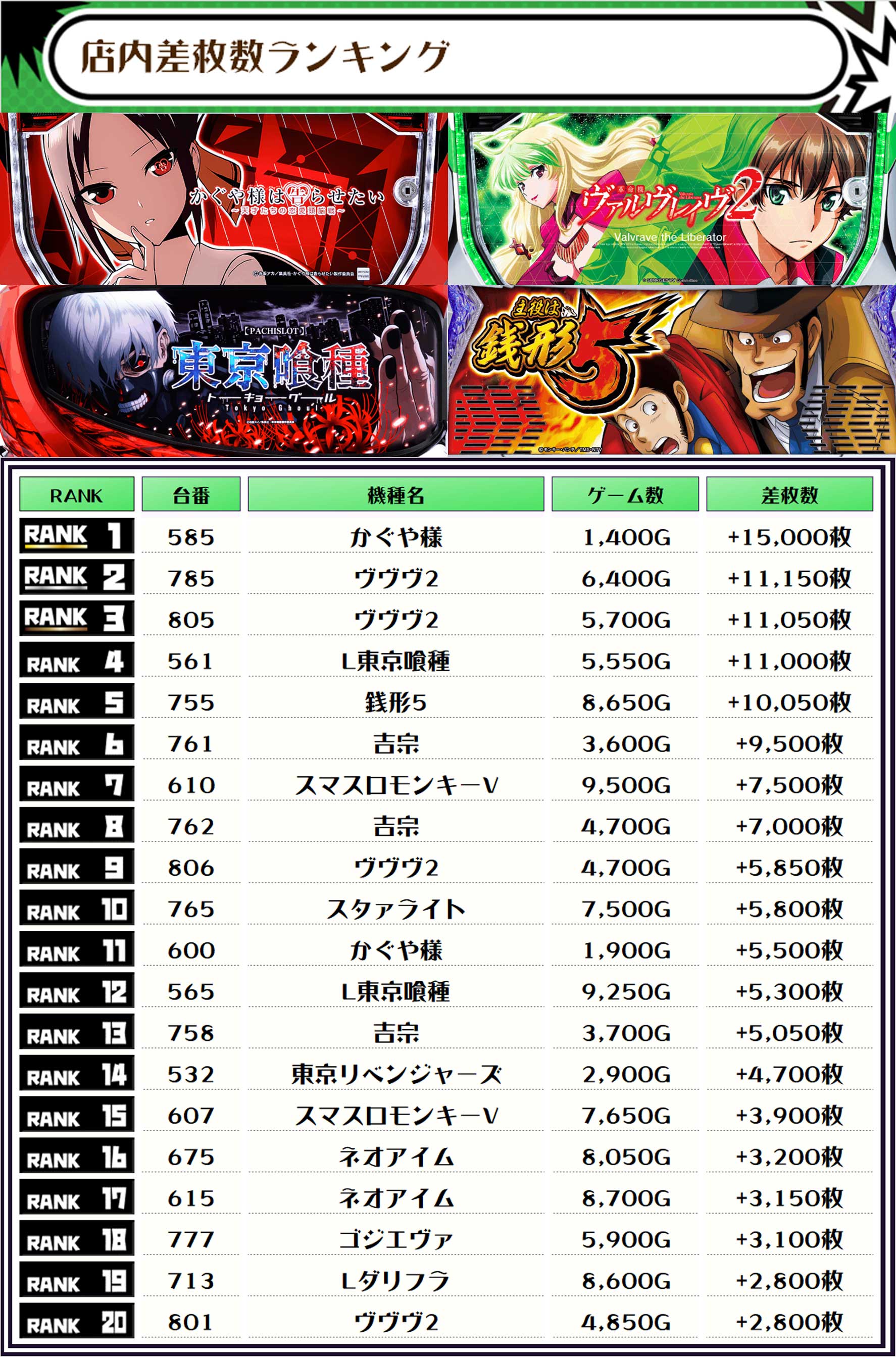 差枚ランキングのTOPは【かぐや様・585番台】で+15,000枚👑