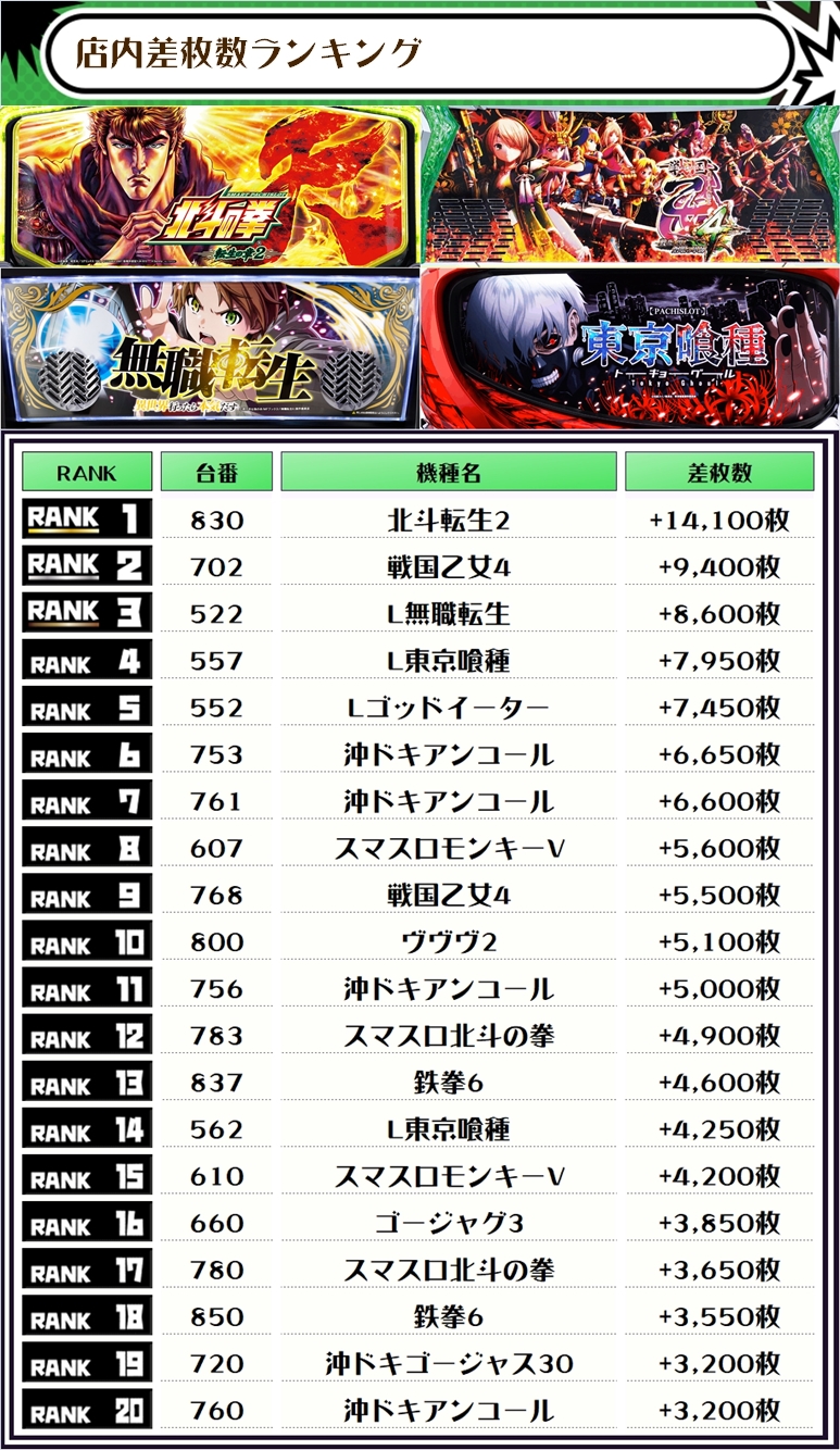 差枚ランキングのTOPは【北斗転生2・830番台】で+14,100枚👑
