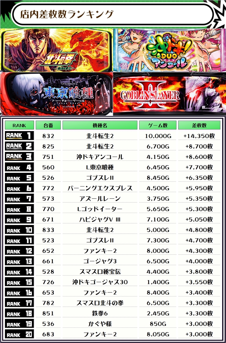 差枚ランキングのTOPは【北斗転生2・832番台】で+14,350枚👑