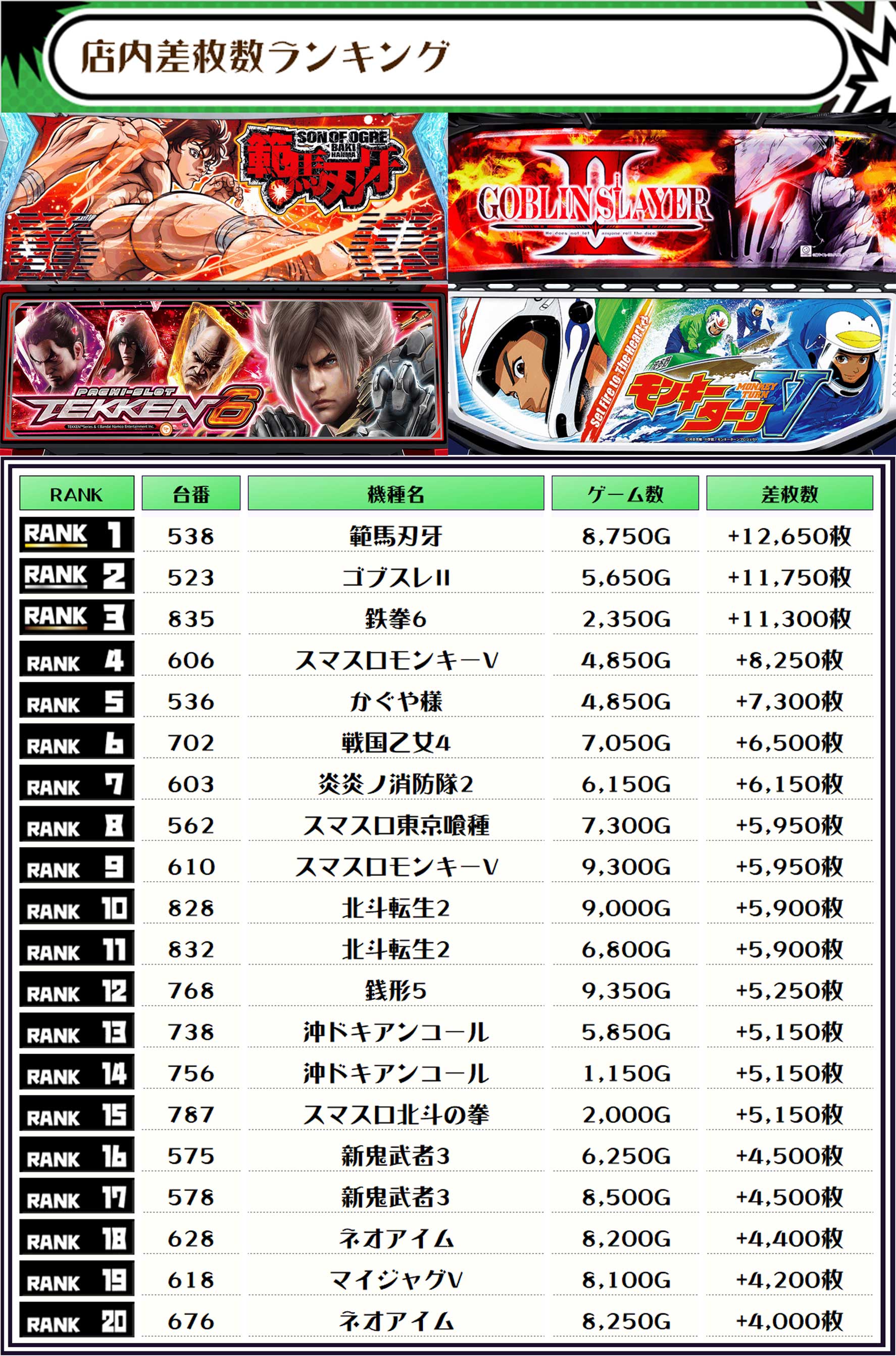 差枚ランキングのTOPは【範馬刃牙・538番台】で+12,650枚👍