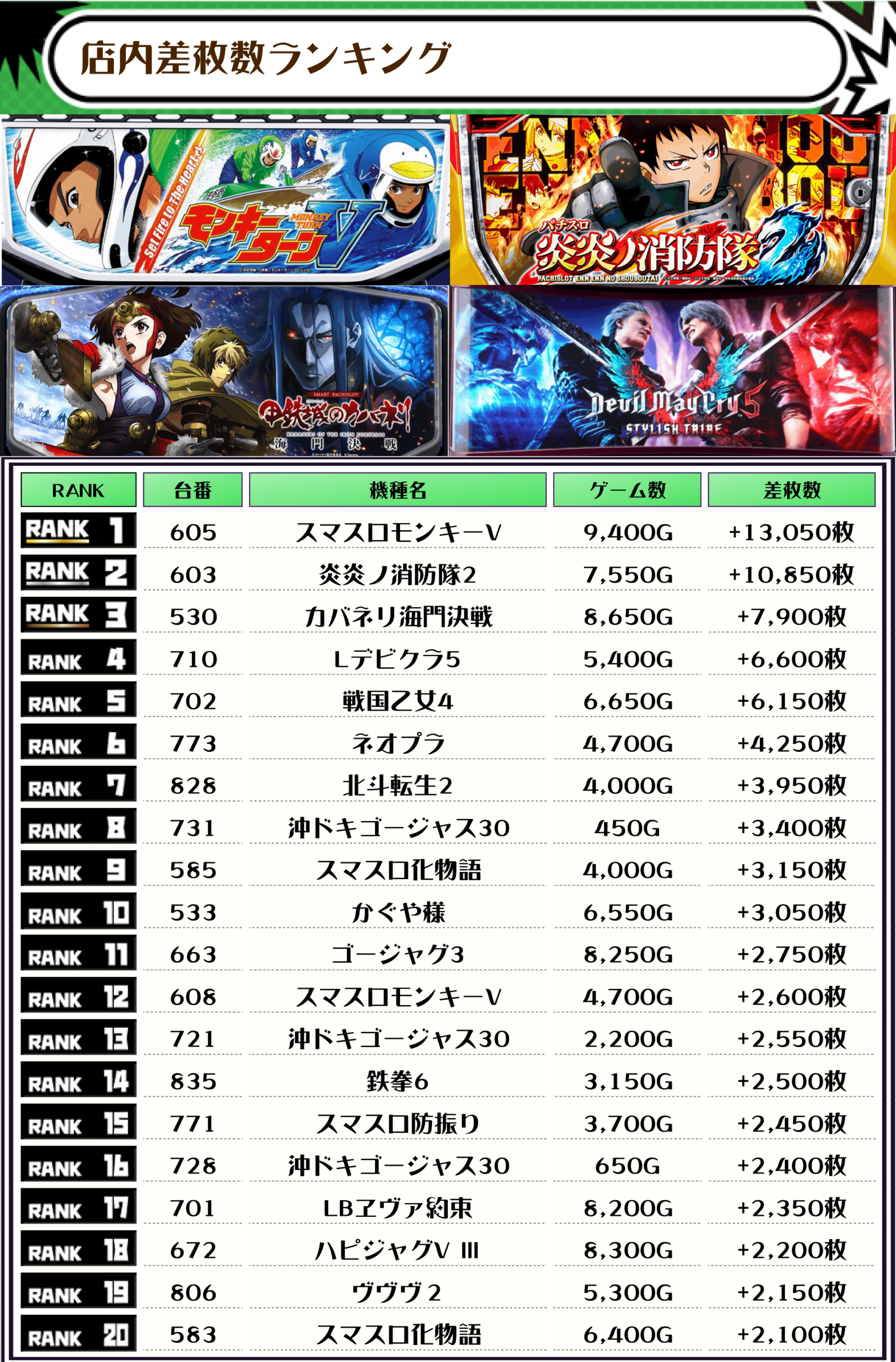差枚ランキングのTOPは【スマスロモンキーV・605番台】で+13,050枚👑