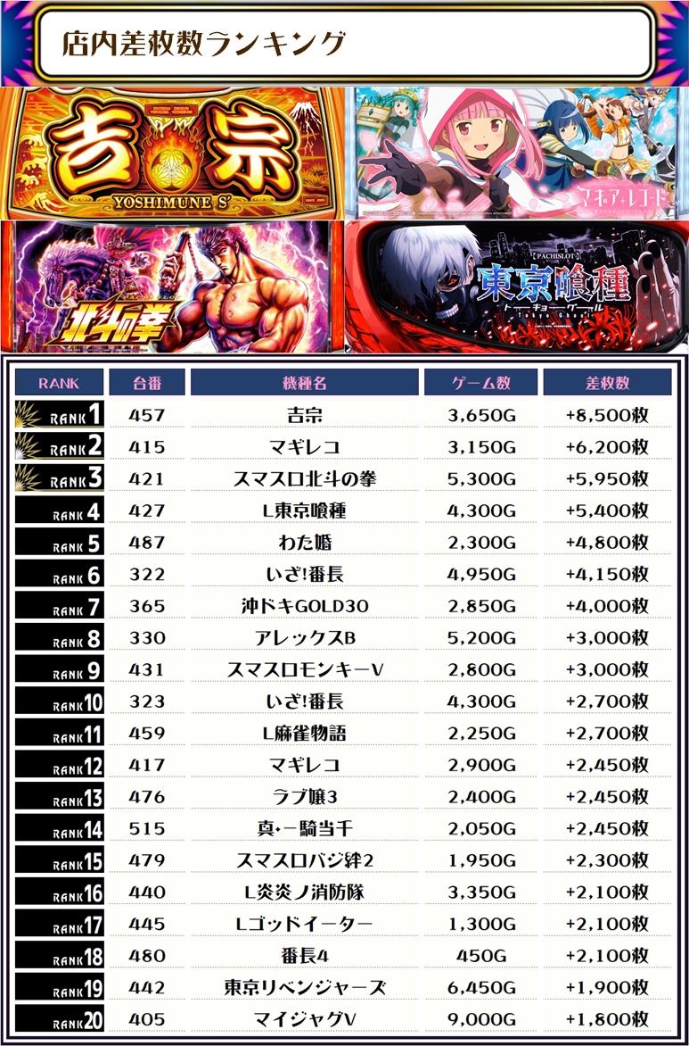 最後に、この日の店内差枚ランキングをご覧ください❗️