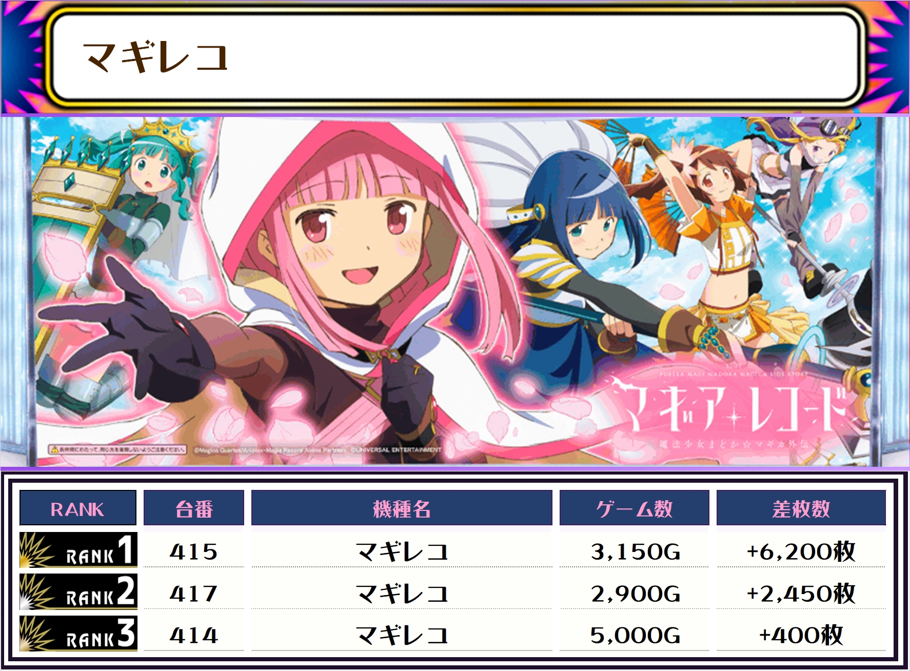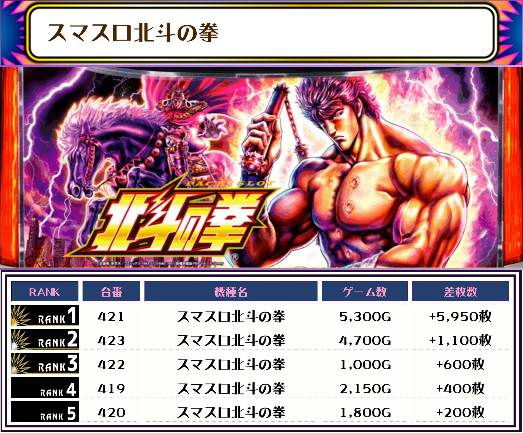 続く2位には【マギレコ・415番台】の+6,200枚、そして3位には【スマスロ北斗の拳・421番台】の+5,950枚がランクインっ🏆🏆🏆🏆