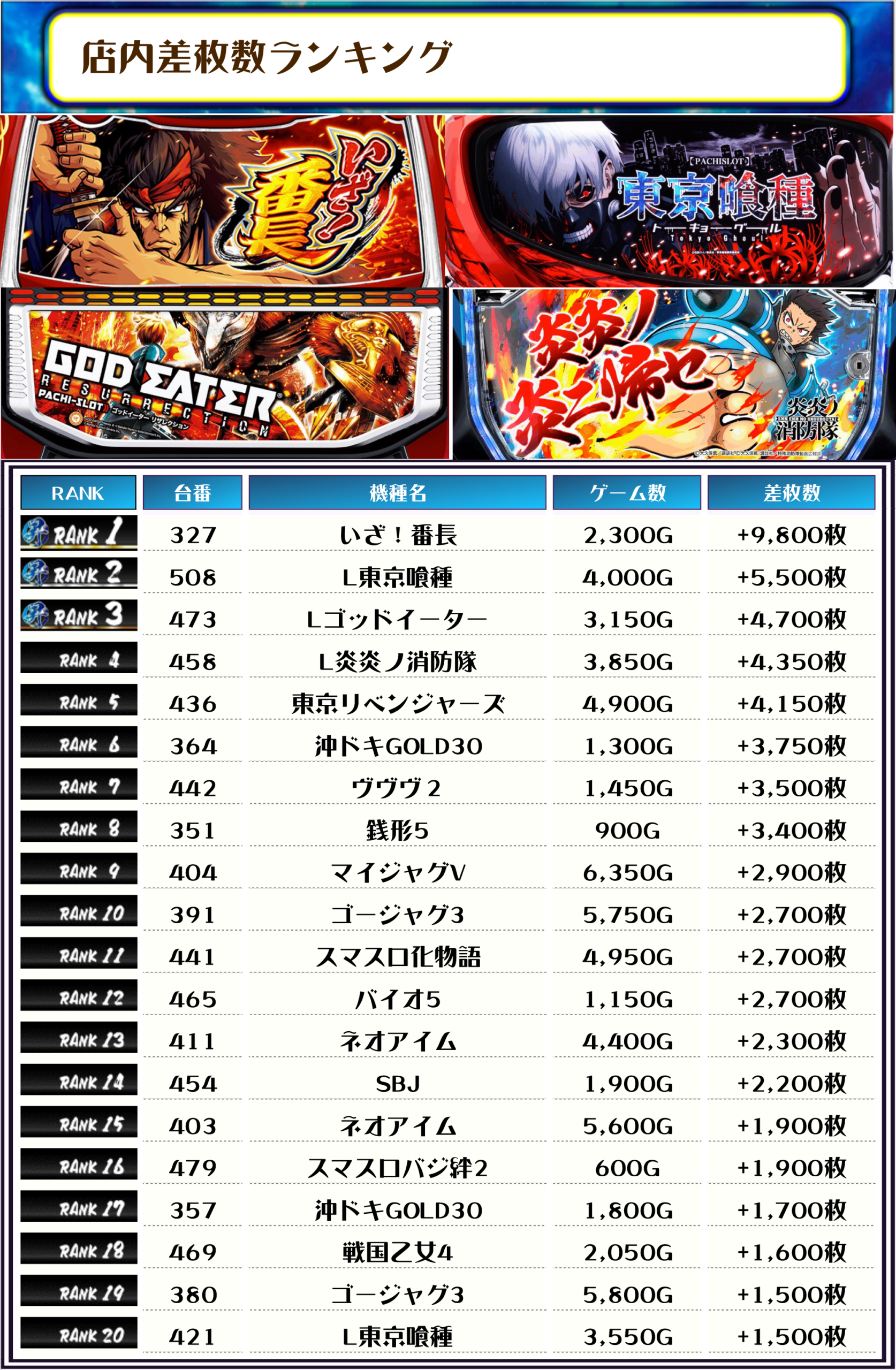 続く2位には【L東京喰種・508番台】の+5,500枚、そして3位には【Lゴッドイーター・473番台】の+4,700枚がランクインっ🏆🏆🏆🏆