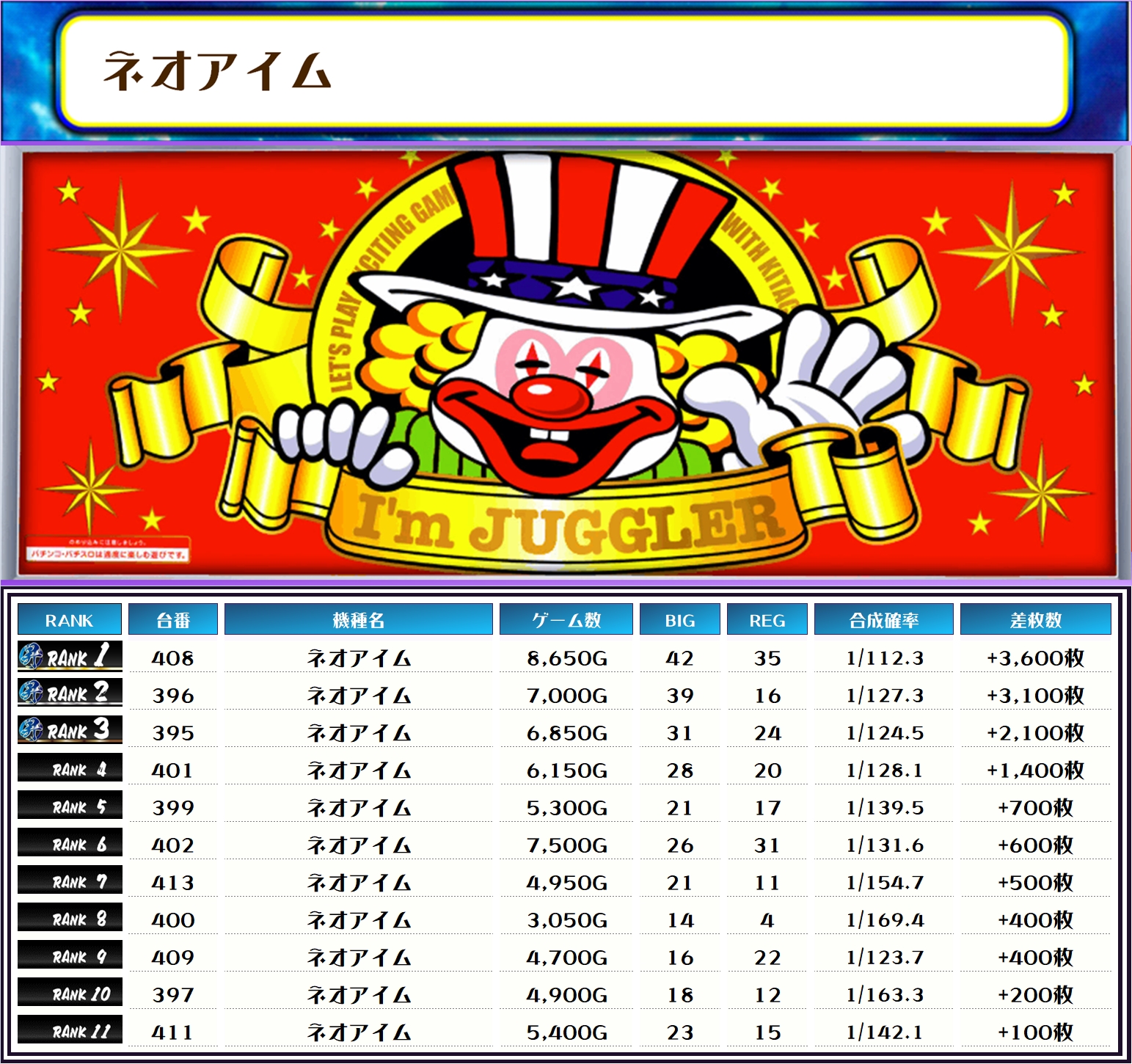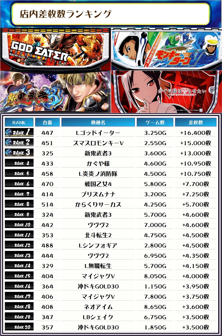 最後に、この日の店内差枚ランキングをご覧ください❗️
