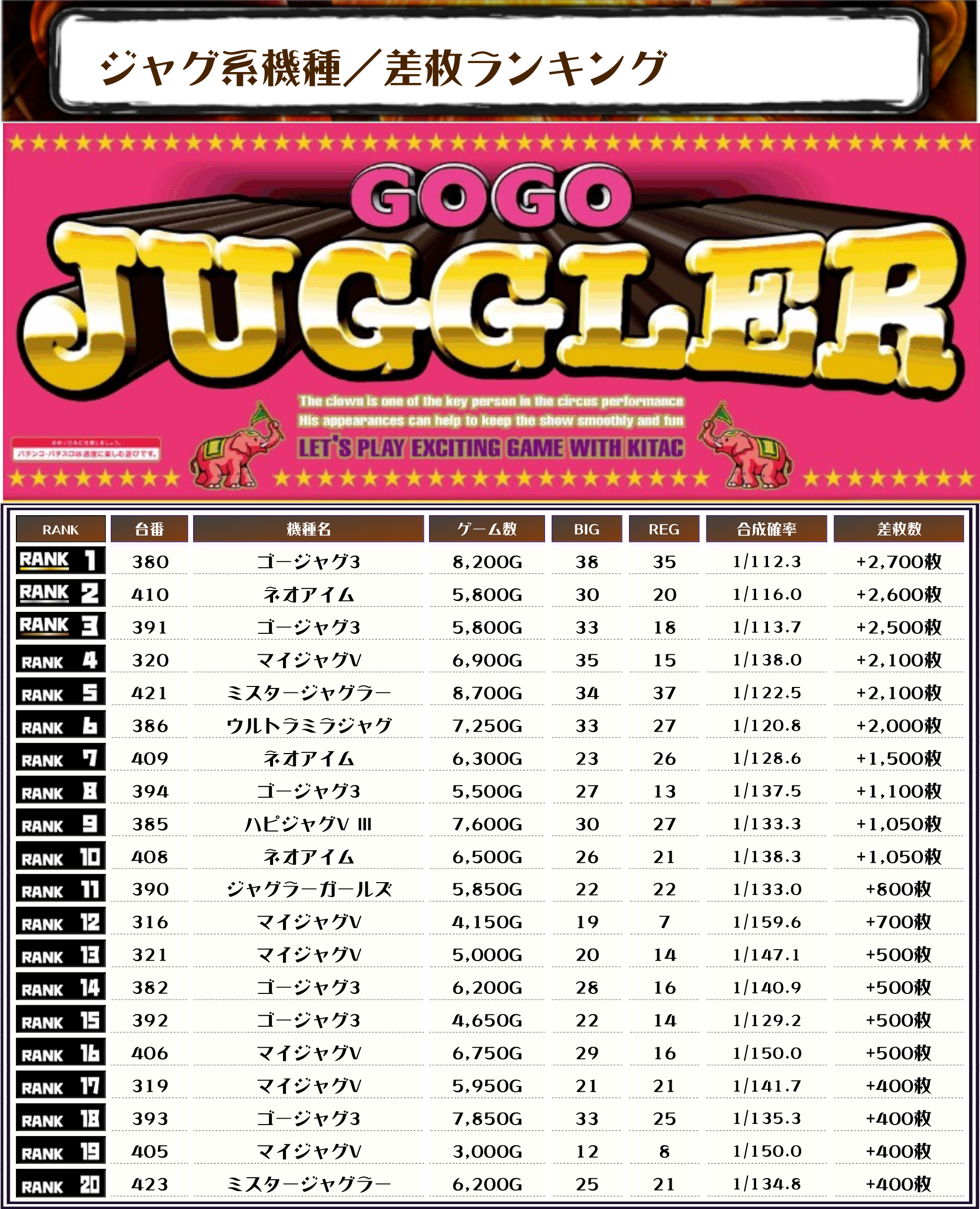 続く2位には【ネオアイム・410番台】の+2,600枚、そして3位には【ゴージャグ3・391番台】の+2,500枚がランクインっ👍