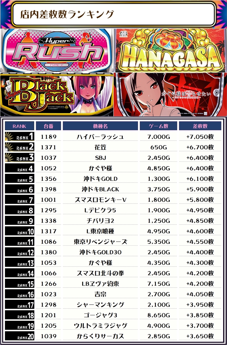 最後に、この日の店内差枚ランキングをご覧ください❗️