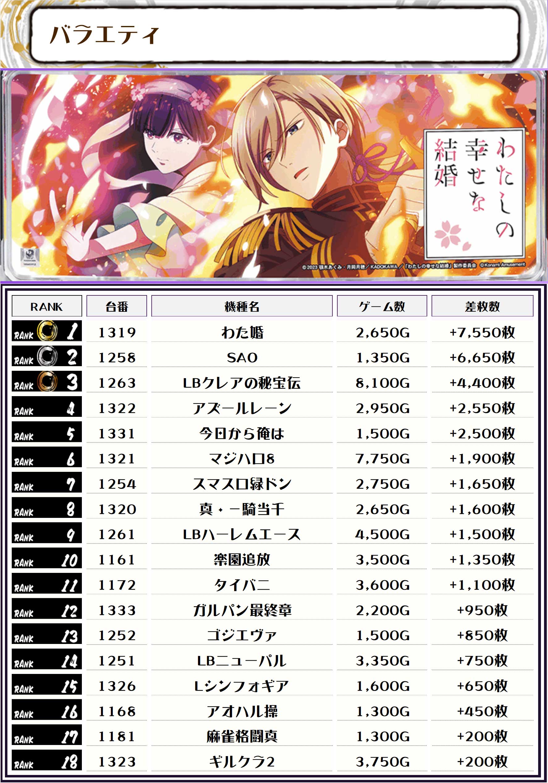 今回のランキングは5000枚オーバーで埋め尽くされる…という非常にハハイレベルな結果に👍