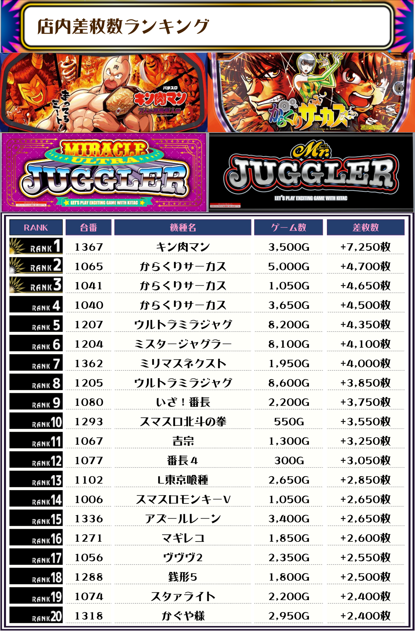 この日、全体の差枚トップに輝いたのは【キン肉マン・1367番台】で+7,250枚‼️