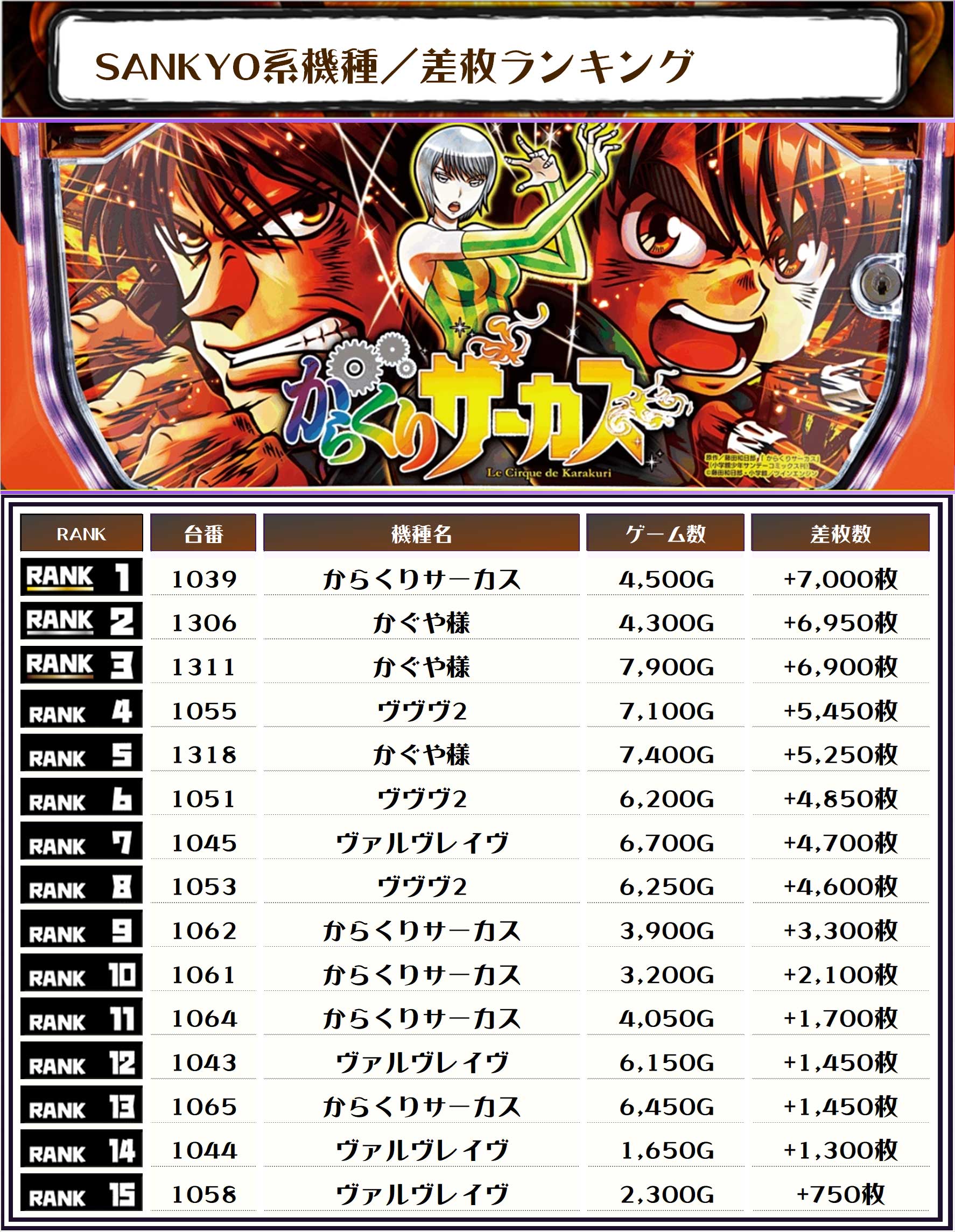 ということで、この日のトップ差枚は【からくりサーカス・1039番台】で+7,000枚👑👑👑