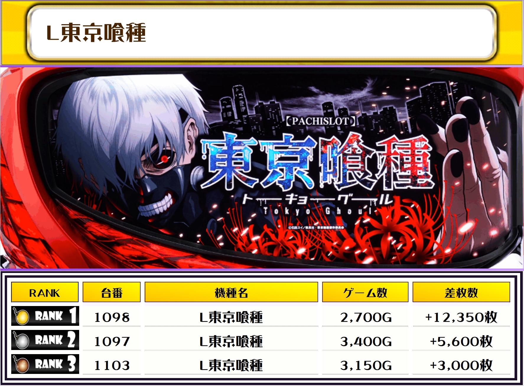 この日、全体の差枚トップに輝いたのは【L東京喰種・1098番台】で+12,350枚‼️