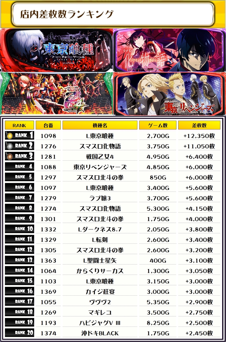 最後に、この日の店内差枚ランキングをご覧ください❗️