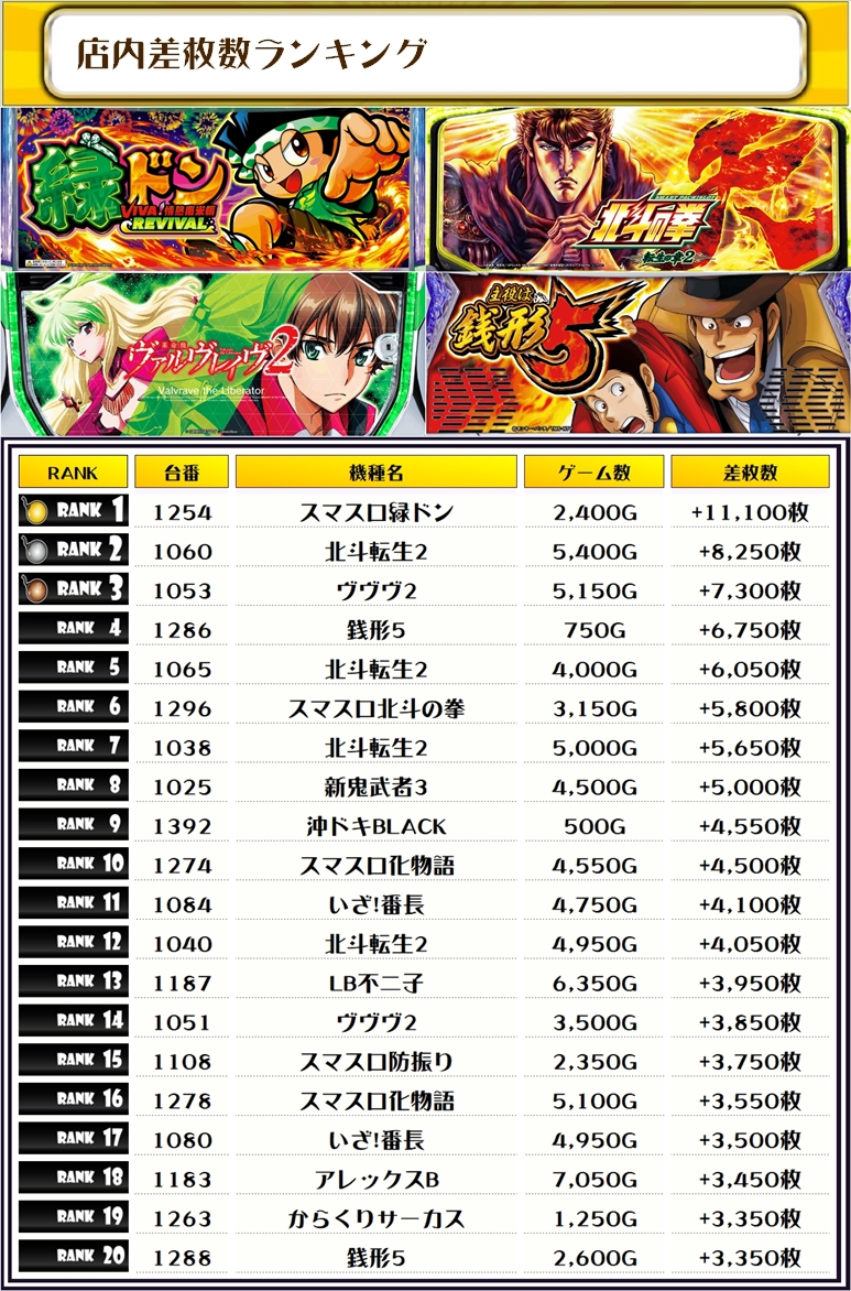続く2位には【北斗転生2・1060番台】の+8,250枚、そして3位には【ヴヴヴ2・1053番台】の+7,300枚がランクインっ🏆
