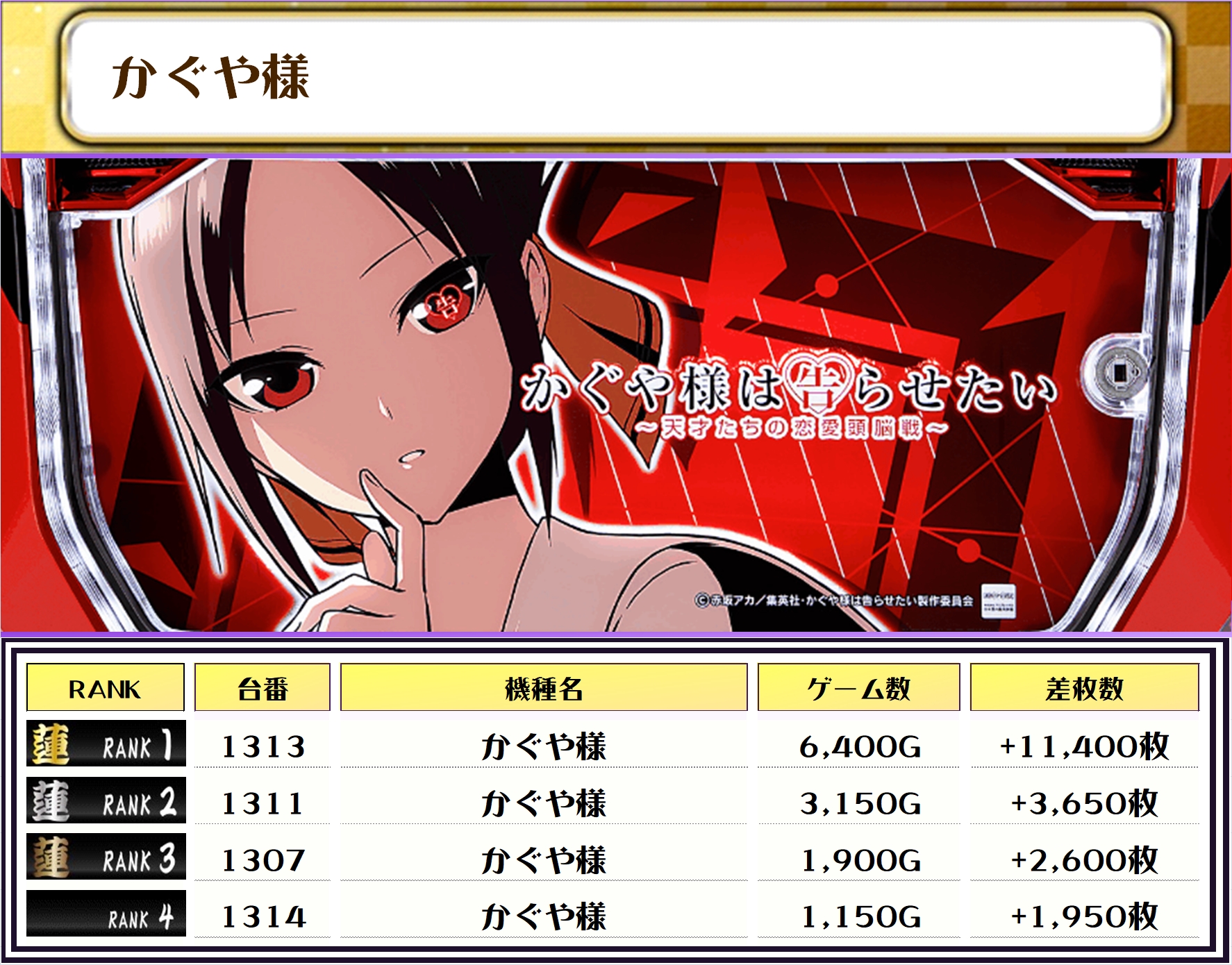 この日、全体の差枚トップに輝いたのは【かぐや様・1313番台】で+11,400枚‼️