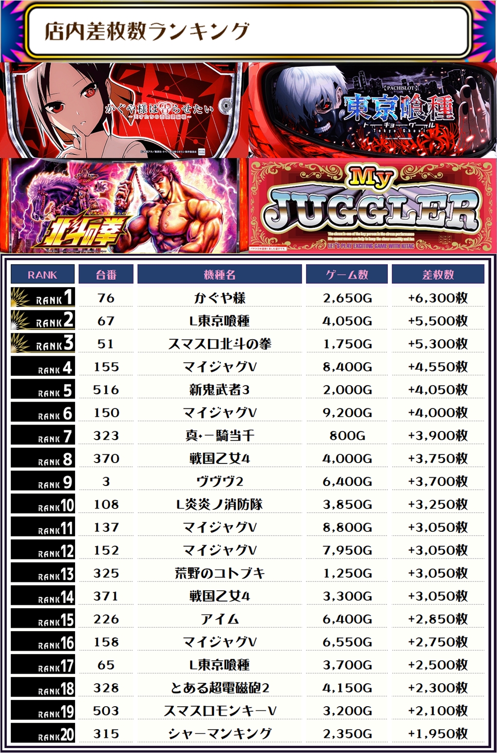 最後に、この日の店内差枚ランキングをご覧ください❗️