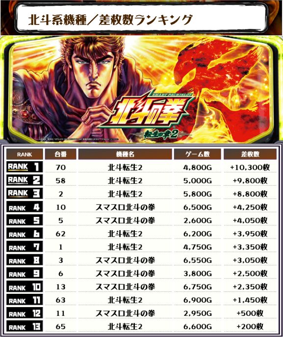 また、2位には【北斗転生2・58番台】の+9,800枚、そして3位には【北斗転生2・2番台】の+8,800枚がランクインしました🏆