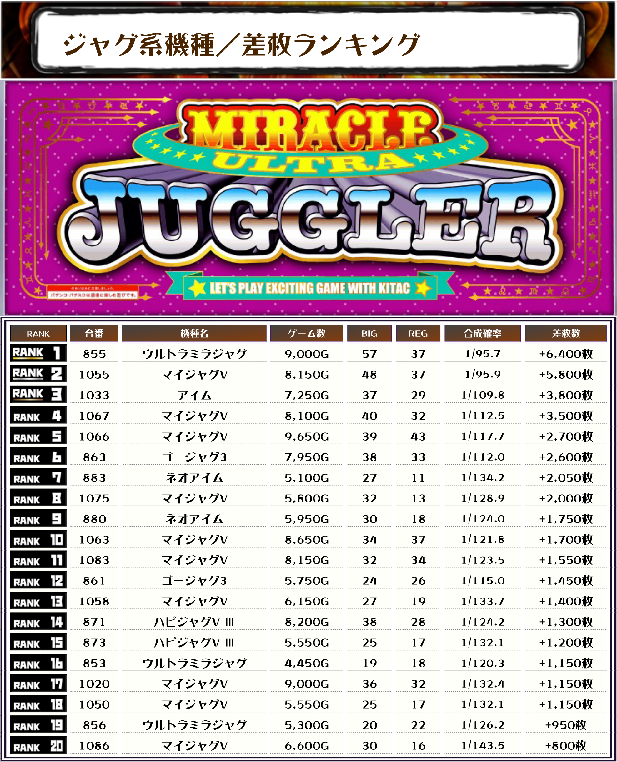 また、2位には【マイジャグV・1055番台】の+5,800枚、3位には【アイム・1033番台】の+3,800枚がランクイン👏