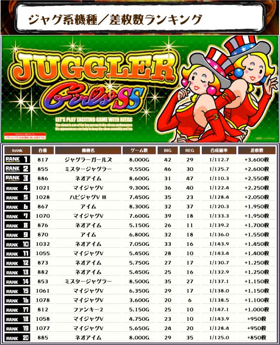 ということで、この日のトップ差枚は【ジャグラーガールズ・817番台】の+3,600枚でした👑