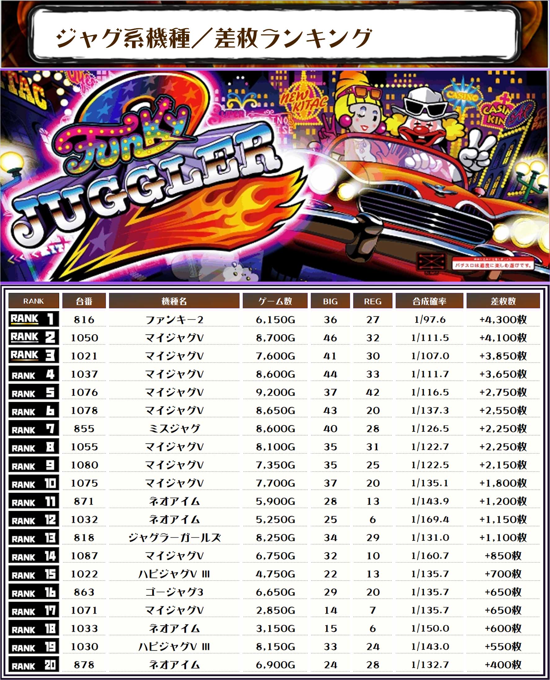 首位に躍り出たのはファンキー2でしたが、マイジャグⅤのランクインが非常に目立ちますねぇ🔍✨