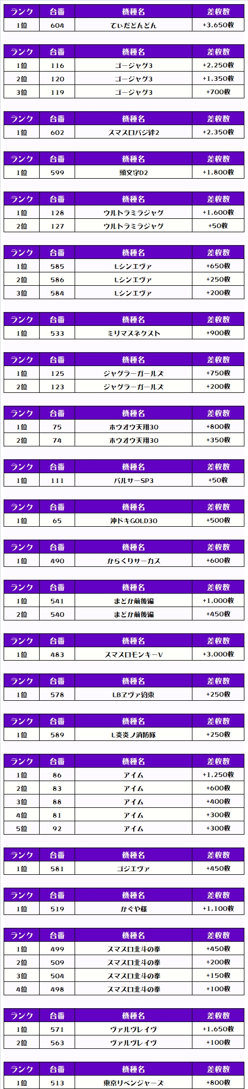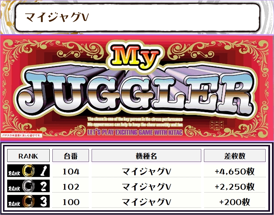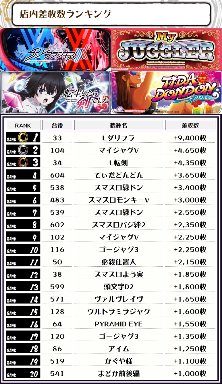 続く2位には【マイジャグV・104番台】の+4,650枚、そして3位には【L転剣・34番台】の+4,350枚がランクインしましたっ🏆🏆🏆