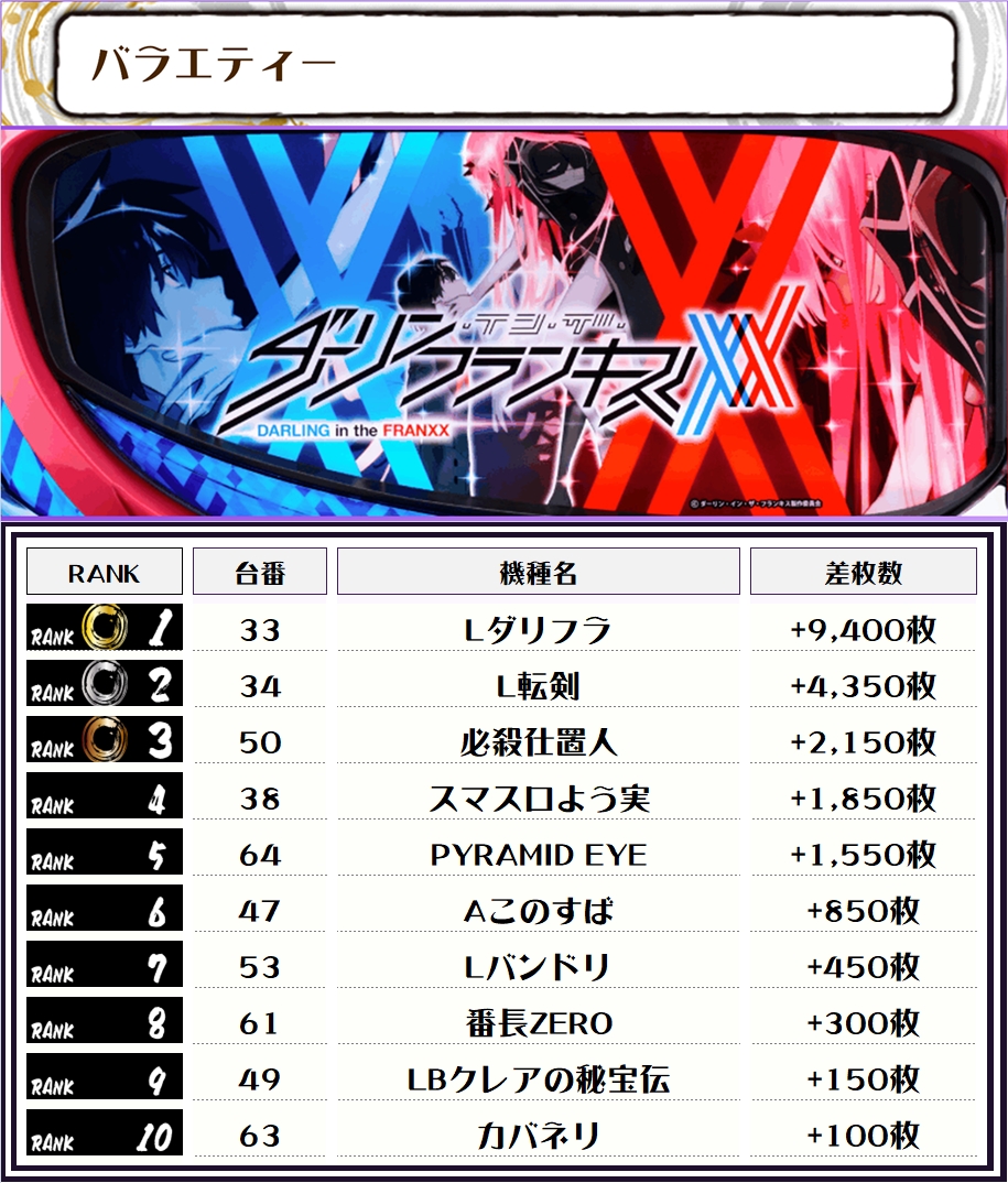 この日、全体の差枚トップに輝いたのは【Lダリフラ・33番台】で+9,400枚‼️