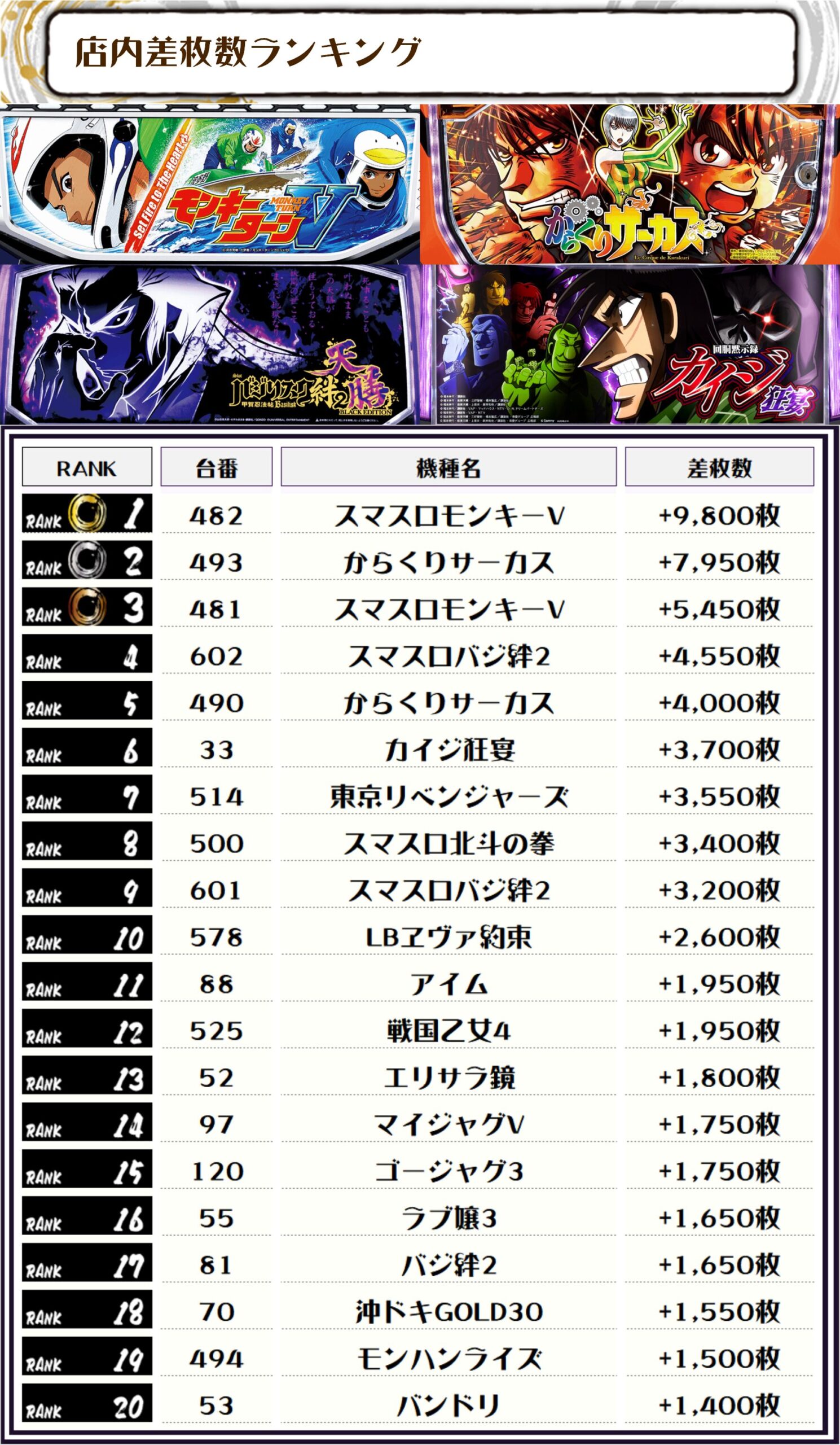 続く2位には【からくりサーカス・493番台】の+7,950枚、そして3位には【スマスロモンキーV・481番台】の+5,450枚がランクインしましたっ🏆🏆🏆