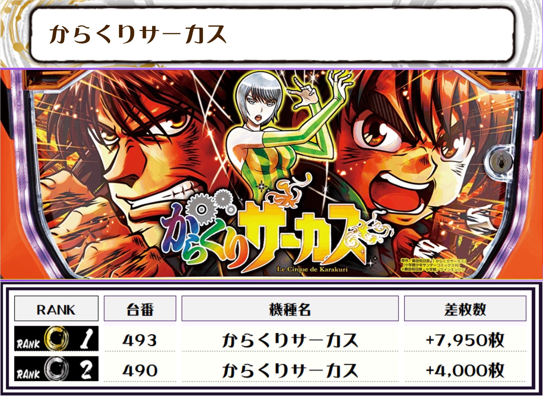 続く2位には【からくりサーカス・493番台】の+7,950枚、そして3位には【スマスロモンキーV・481番台】の+5,450枚がランクインしましたっ🏆🏆🏆
