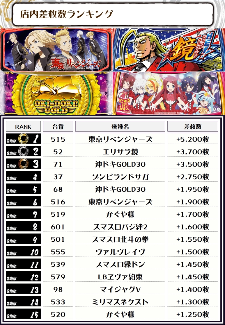 この日、全体の差枚トップに輝いたのは【東京リベンジャーズ・515番台】で+5,200枚‼️