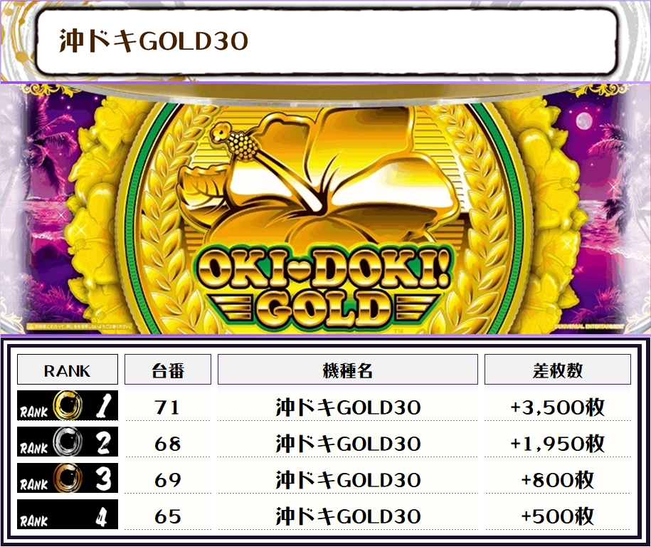 続く2位には【エリサラ鏡・52番台】の+3,700枚、そして3位には【沖ドキGOLD・71番台】の+3,500枚がランクインしましたっ🏆🏆🏆