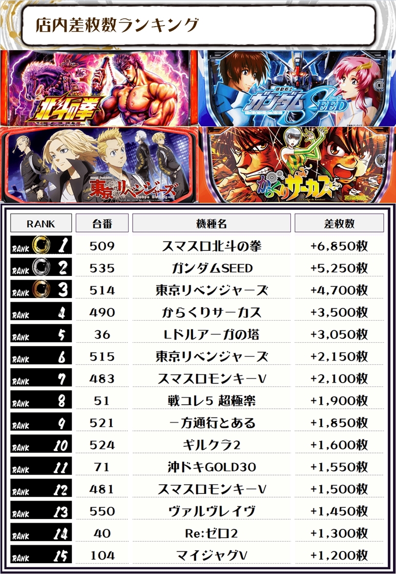 この取材では複数台設置の全機種および全体差枚トップ15をランキング形式でお伝えしていきます❗️