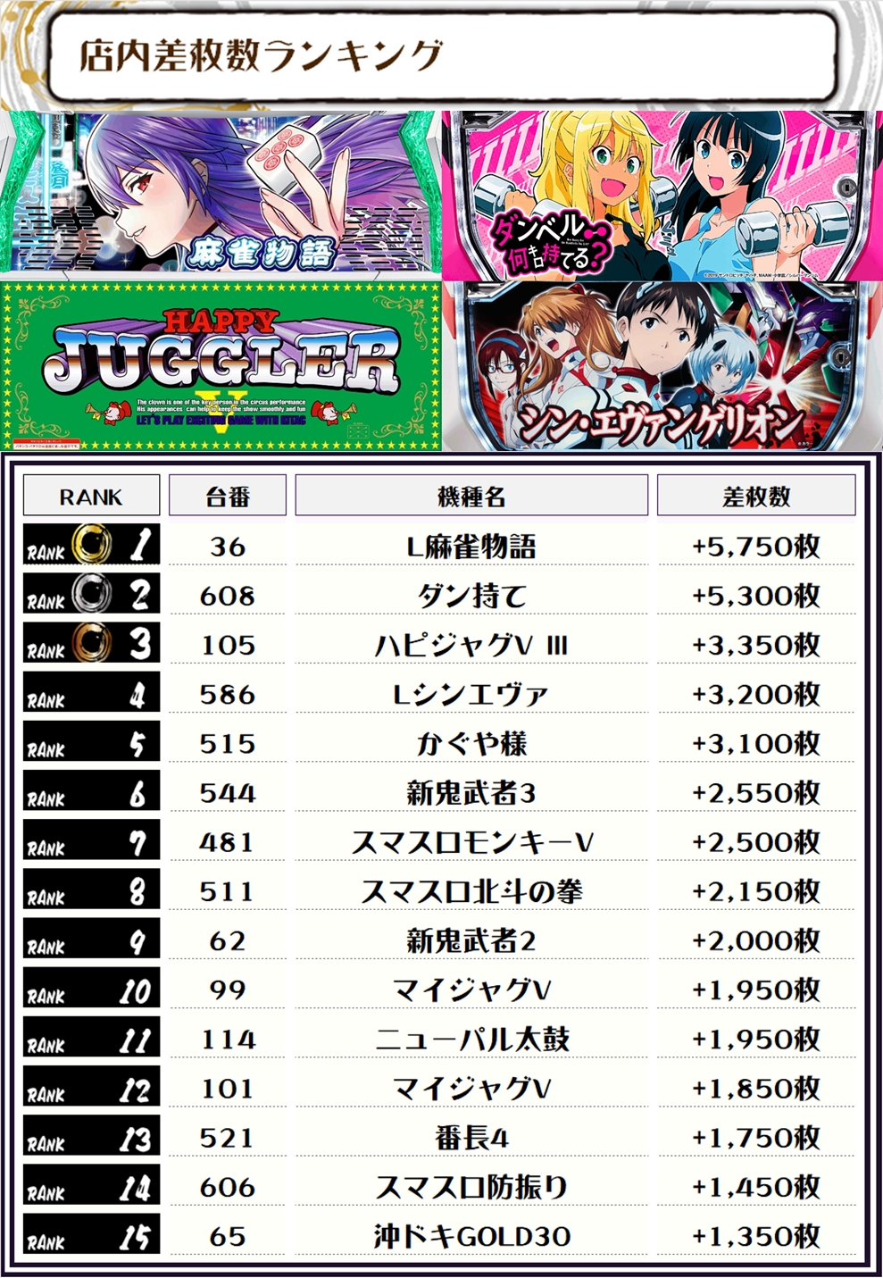 この取材では複数台設置の全機種および全体差枚トップ15をランキング形式でお伝えしていきます❗️