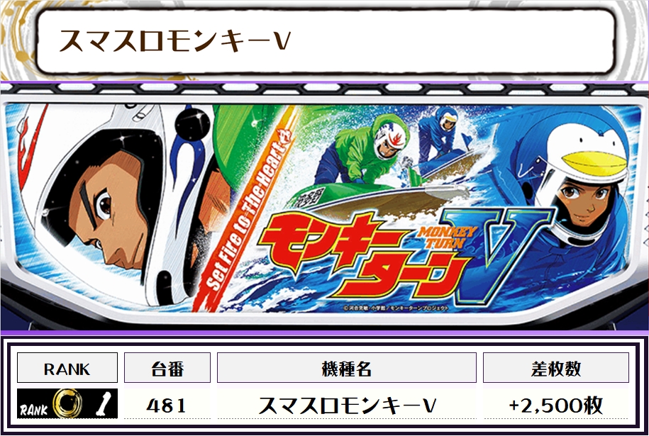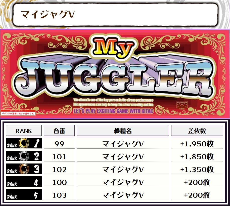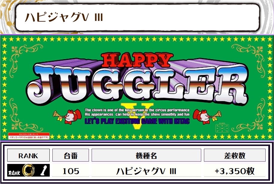 続く2位には【ダン持て・608番台】の+5,300枚、そして3位には【ハピジャグV Ⅲ・514番台】の+3,350枚がランクインしましたっ🏆🏆🏆